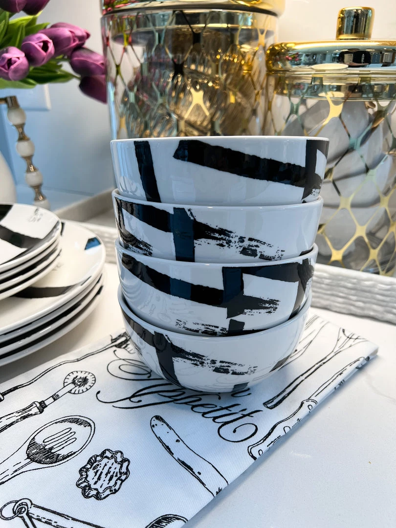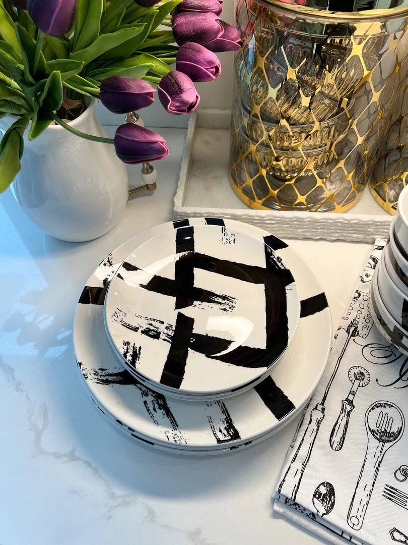 Description: This set of 12 dinnerware set has such a cool black brushstroak pattern! It is a great option to bring some texture to your tablesetting!