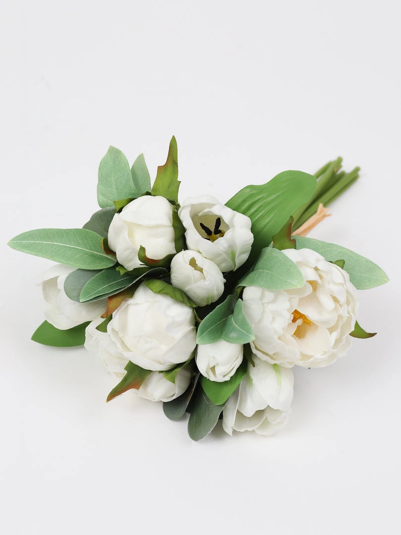 Description: This mixed floral bundle features real-touch white peonies, tulips and eucalyptus. It is a very fresh and clean look and is perfect to style a bundle or 2 in your vase!