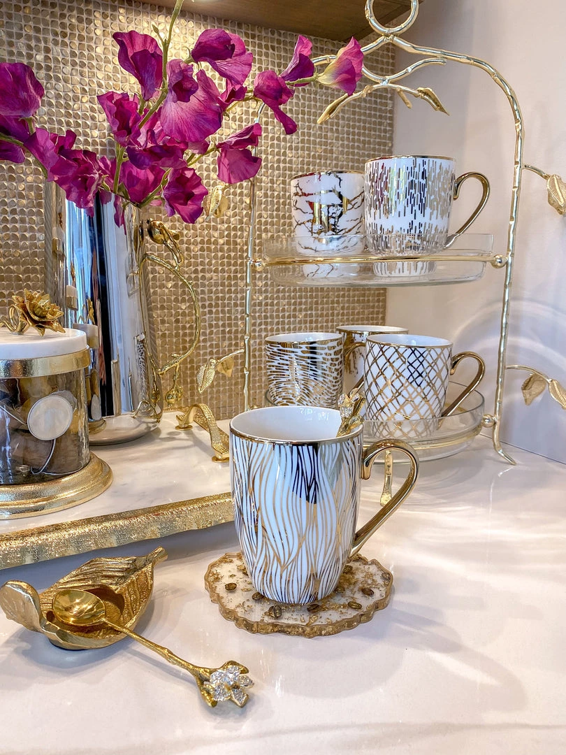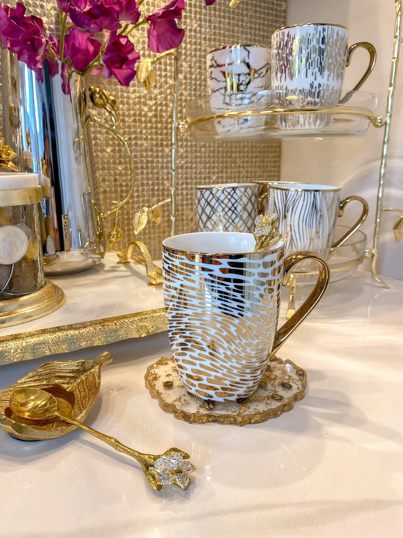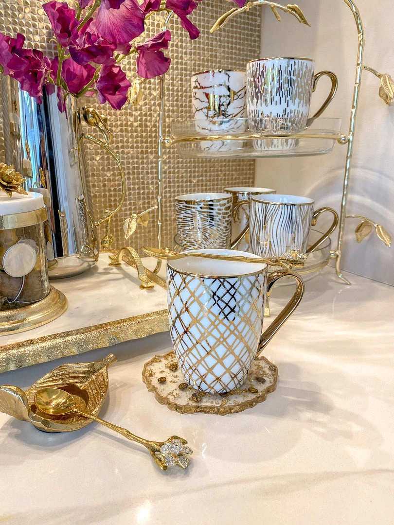 Description: Beautiful white and Gold metallic mugs with 6 different designs!