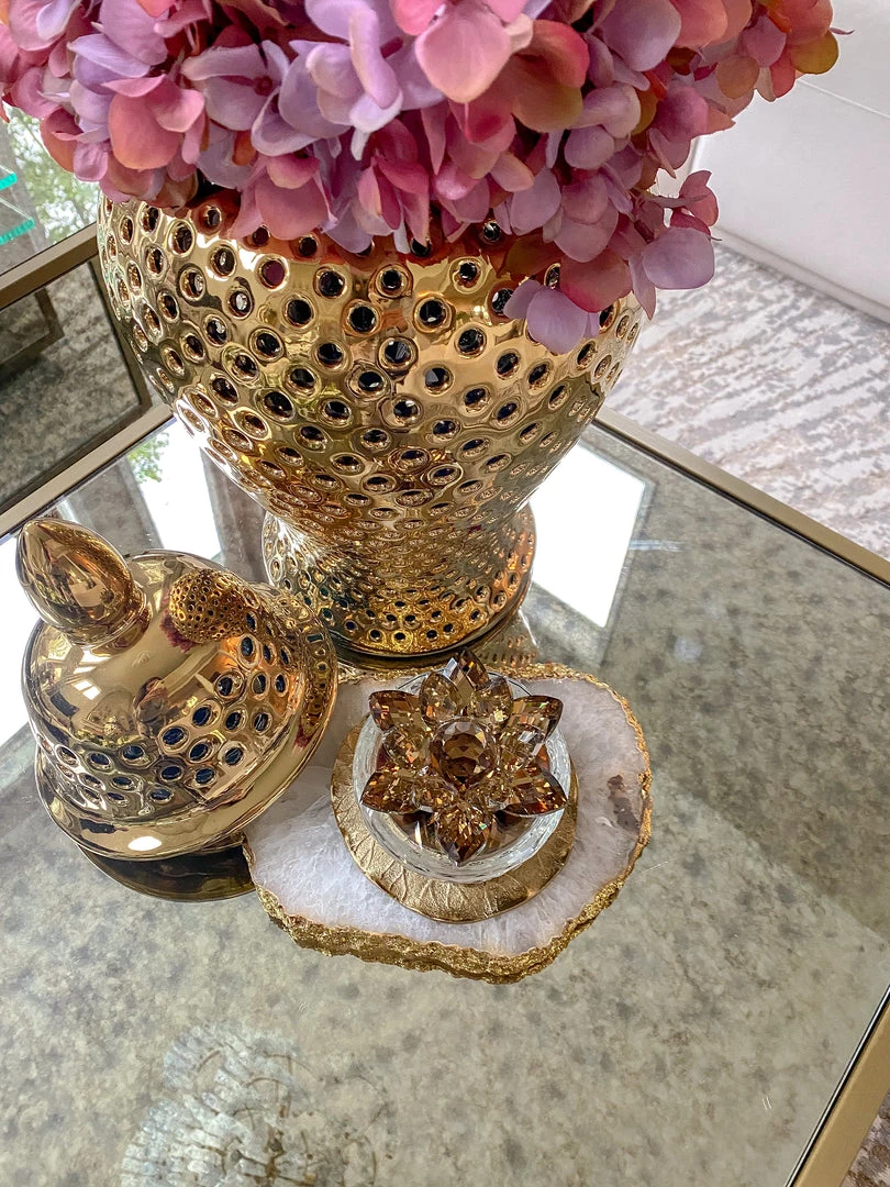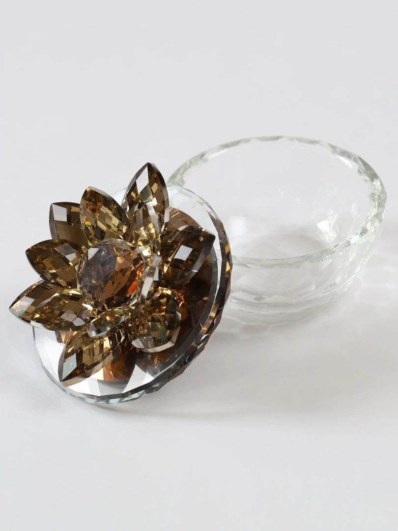 This amber crystal flower box can be stunning decor on its own or can be used to glamorously store items in the bathroom, kitchen, living room, office, etc!