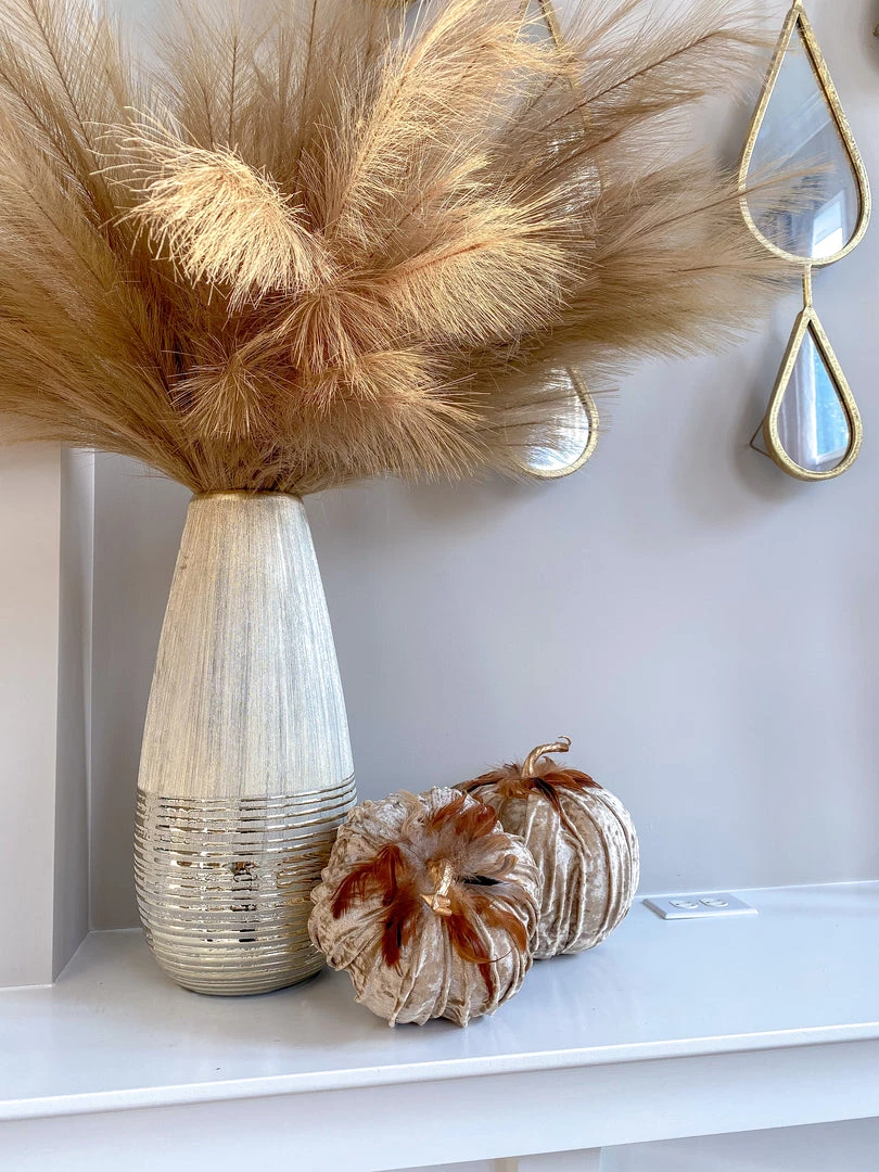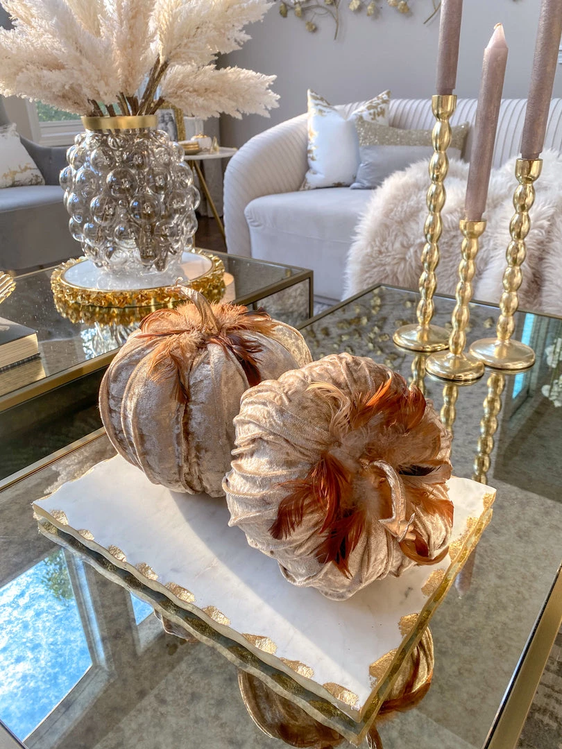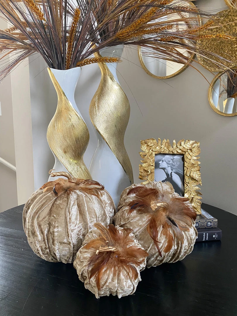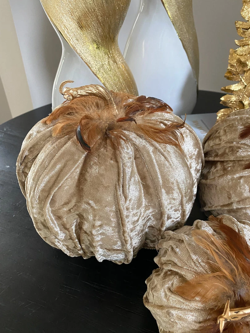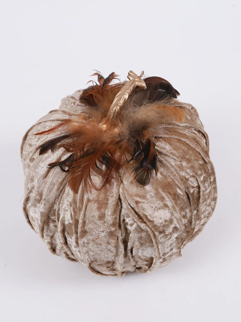 Description: These velvet pumpkins are the perfect home accessory for fall! Featuring a texured beige velvet and beautiful soft feathers, fall never looked so elegant! Available in 3 sizes, each sold separately.