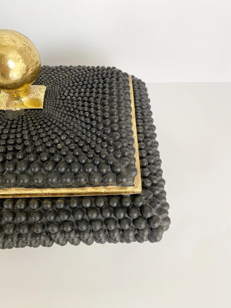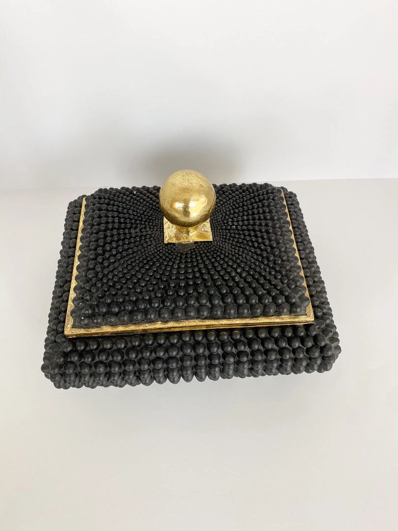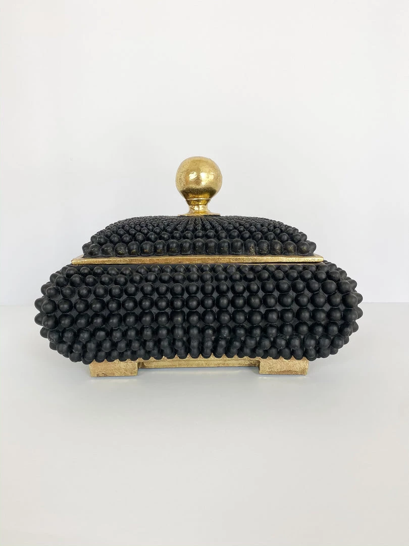 This black studded box is absolutely stunning! The gold detailing adds such a luxurious touch. Perfect for adding a bit of elegance to my living room decor.