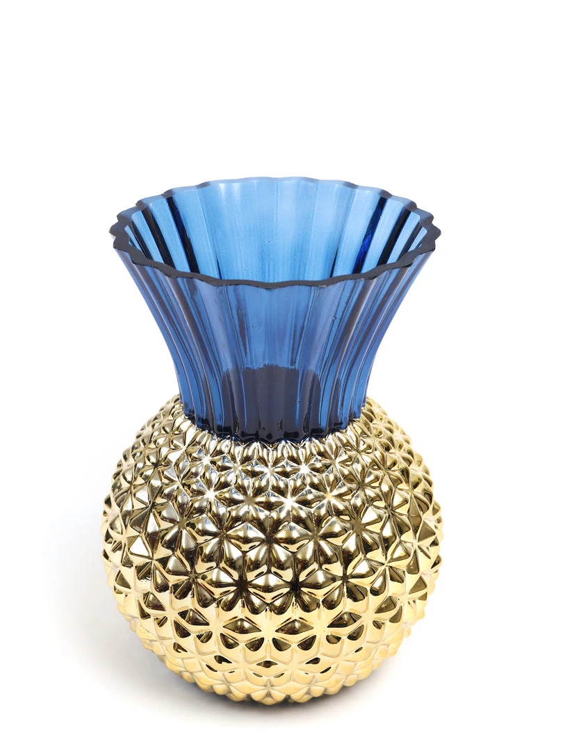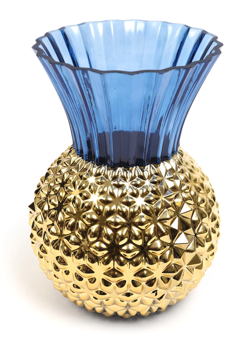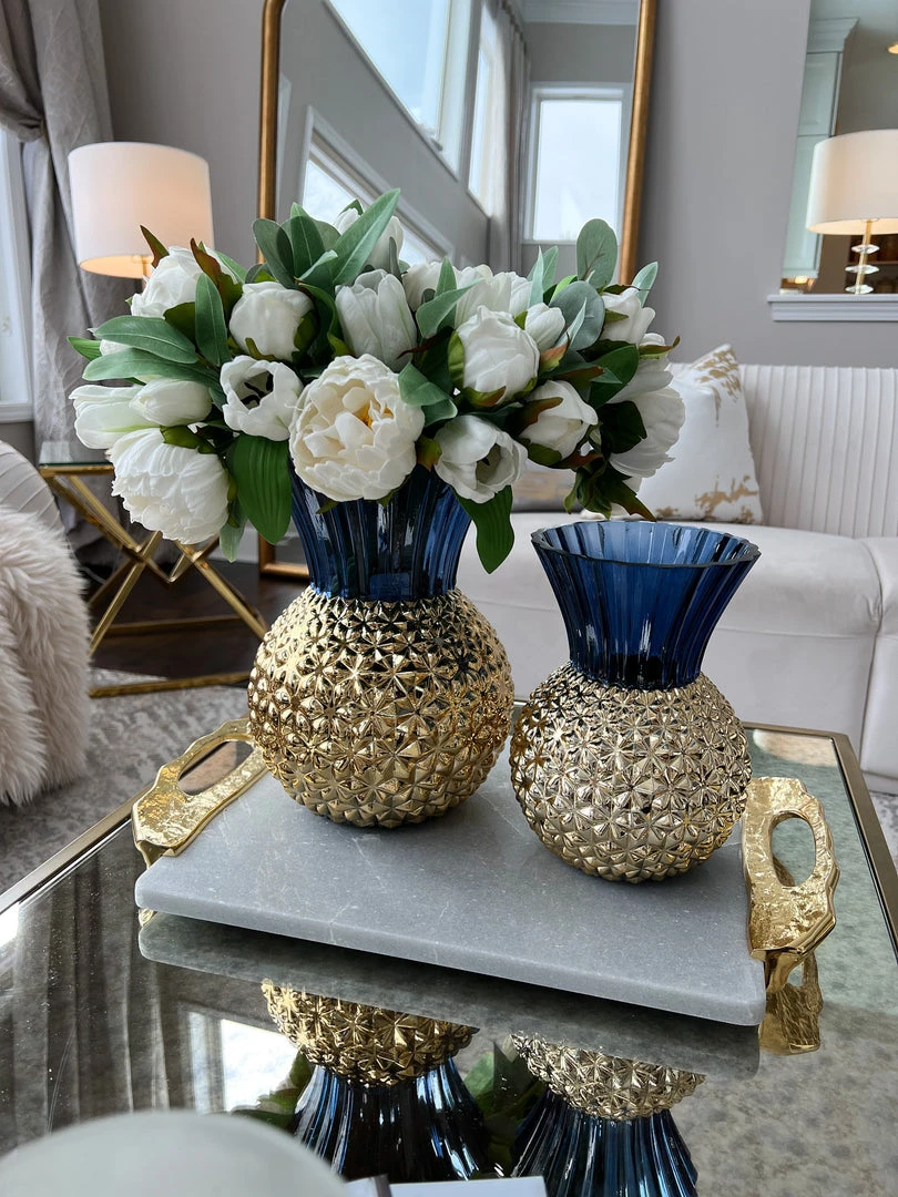 Description: This stunning textured gold vase has a gorgeous navy blue fluted top and will be perfect all year round to display your favorite florals!