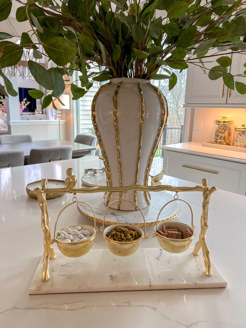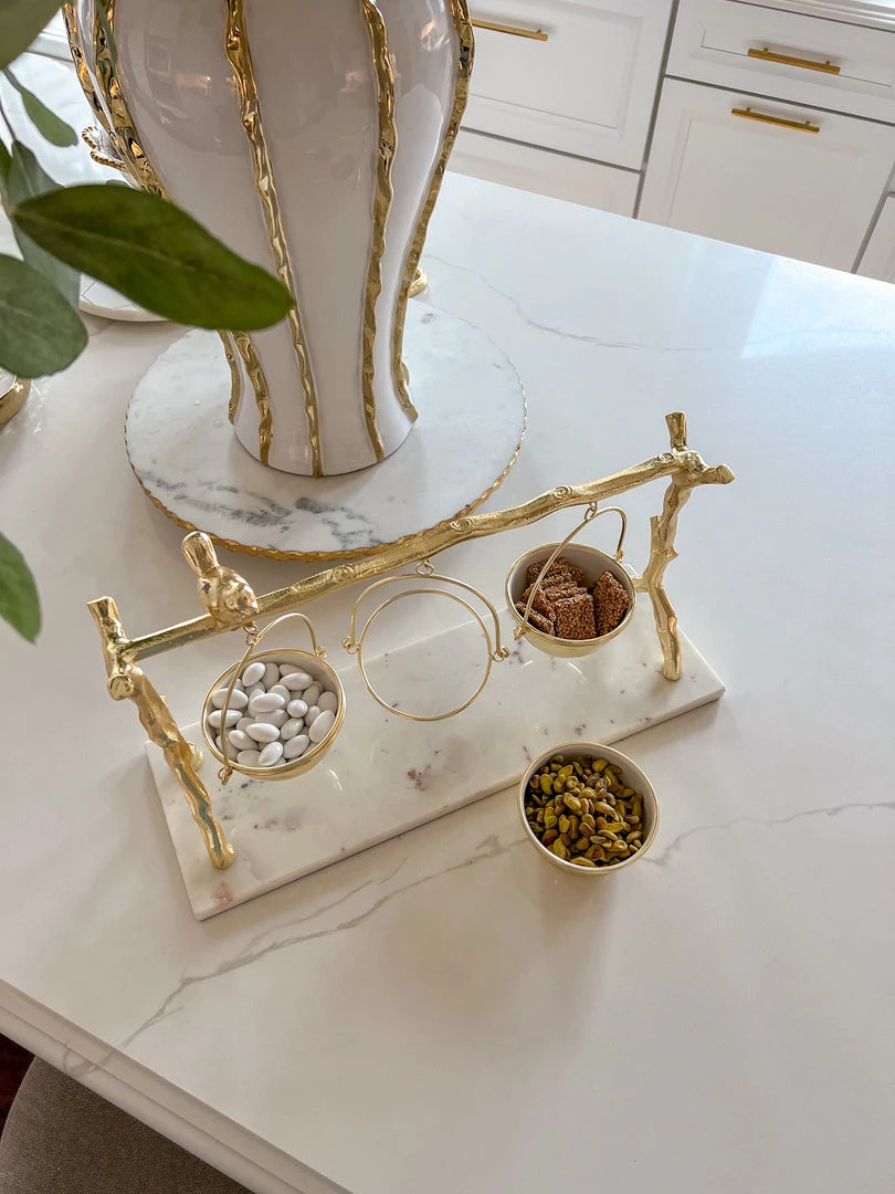 Description: This marble serving tray has three hanging bowls and is detailed with gold branches and a golden bird perched on top! This is one stunning piece!