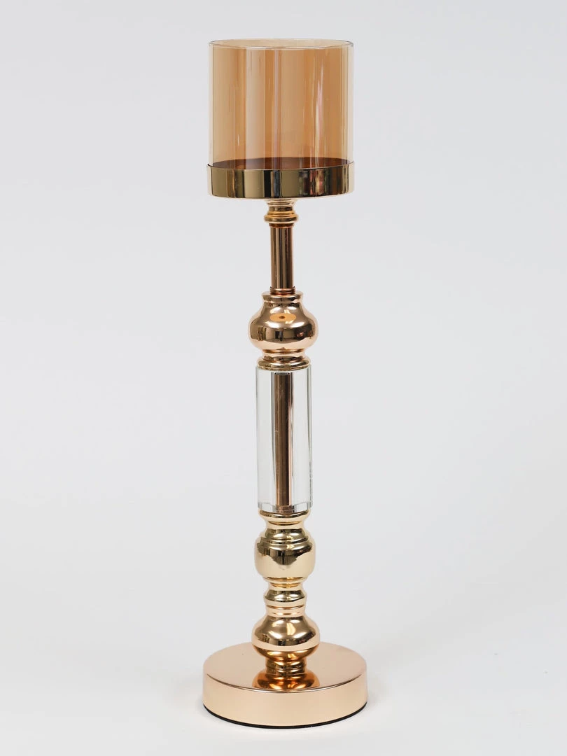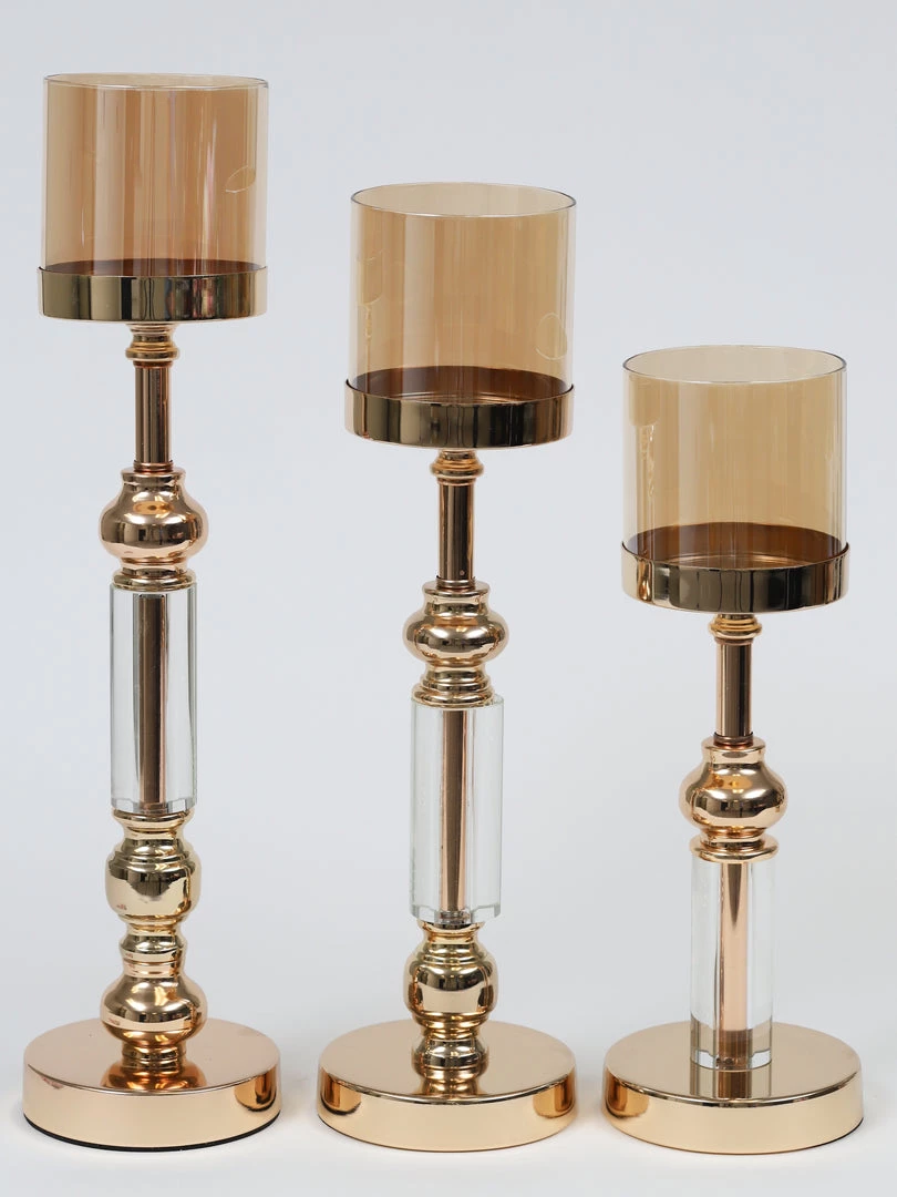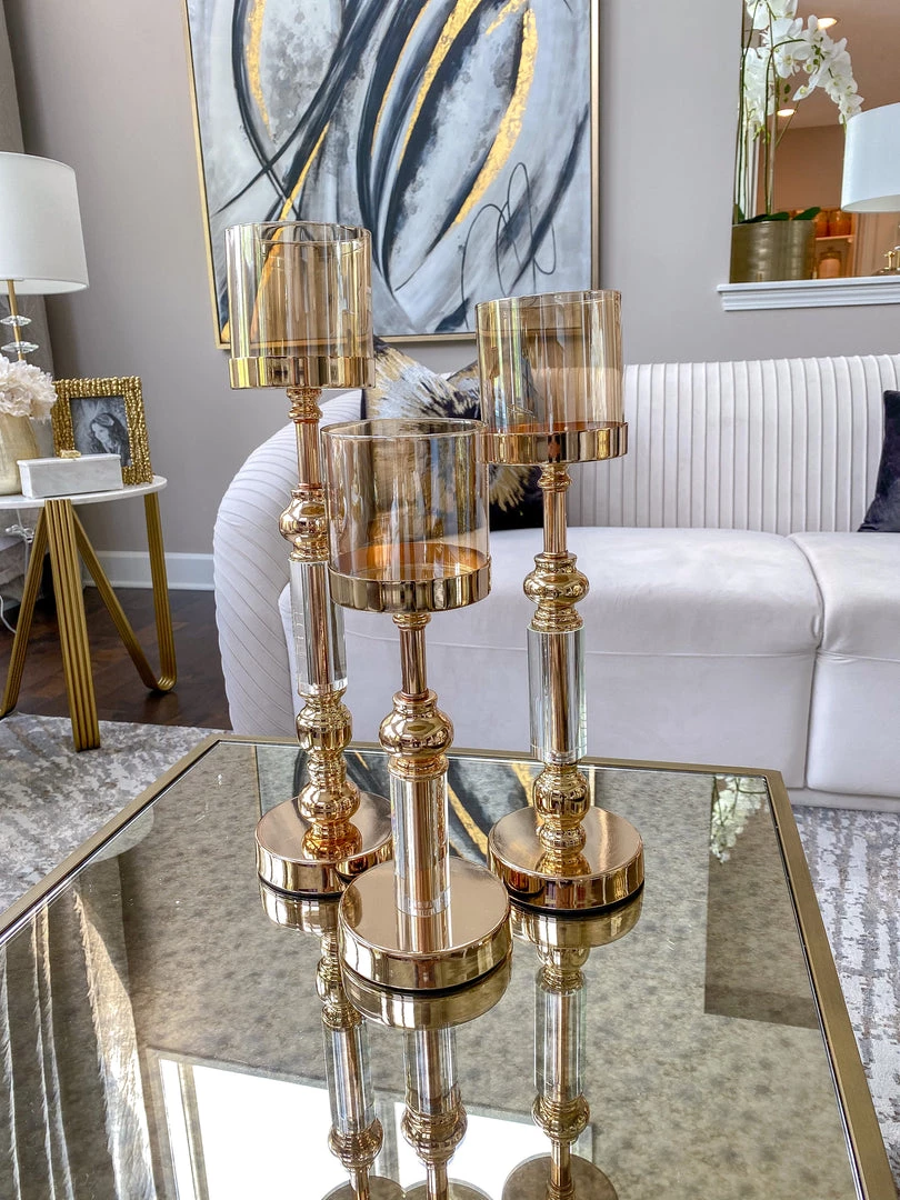 Description: These candle sticks are absolutely beautiful! We love the classic design with a modern twist, and the amber glass hurricane glass completes the look! Sold as a set of 3.