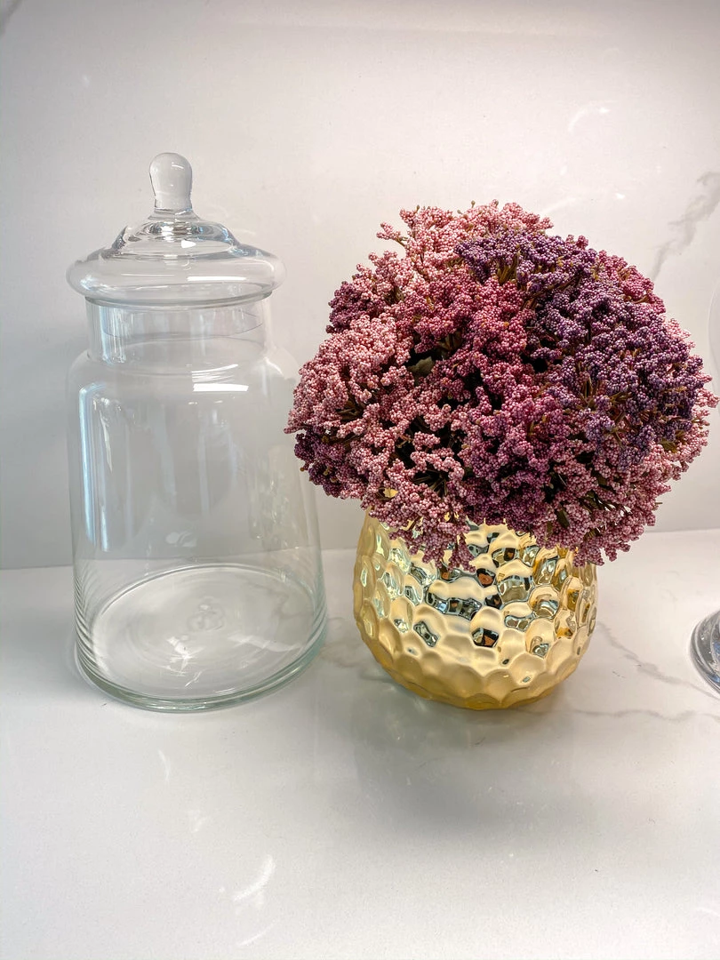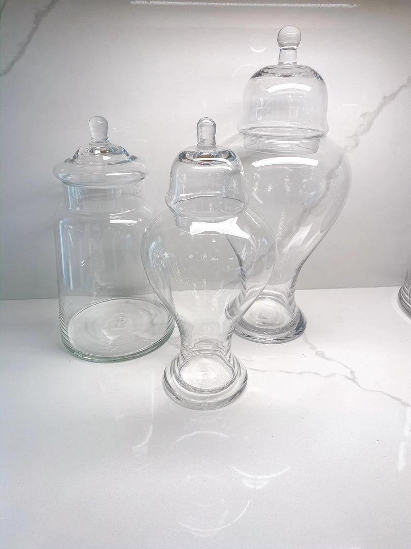 Description: These glass apothecary jars have a fun and interesting shape and are perfect to hold things or as a vase!