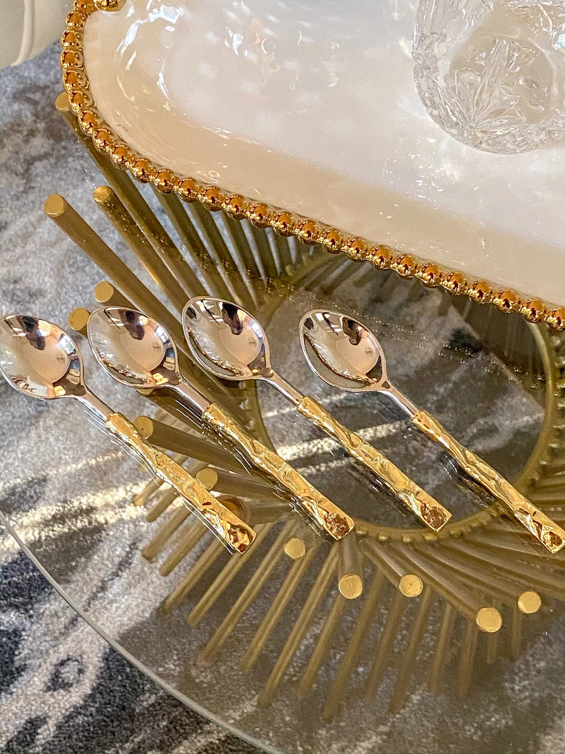 These spoons are great for your tea cups and for displaying on your coffee station. They match the Crumpled Gold Handle Forks perfectly!