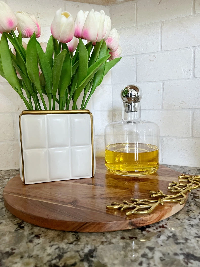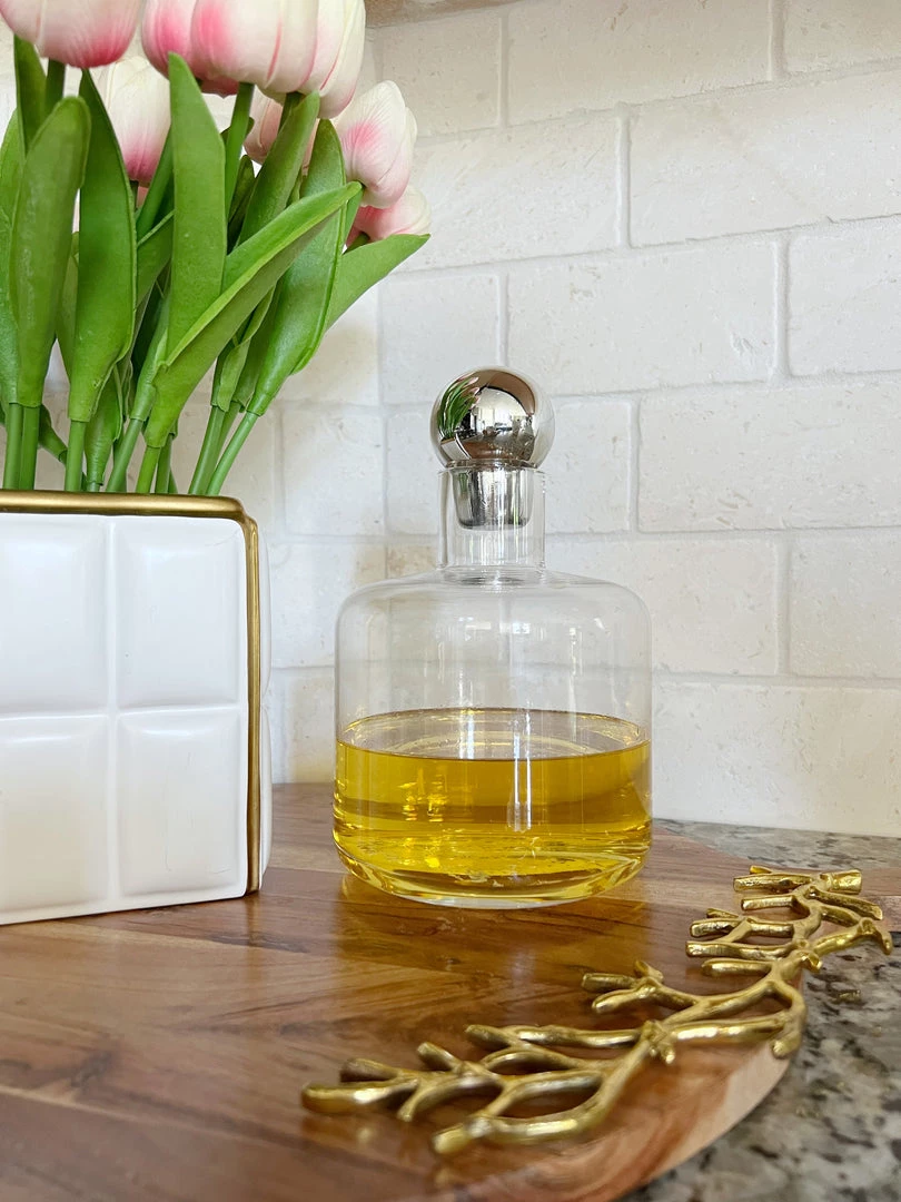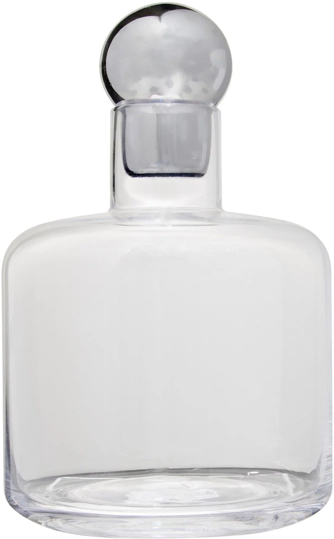 Description: This elegant glass decanter is a simple yet stylish piece! Topped with a round silver stopper, this is a simple way to add some glam to a room.