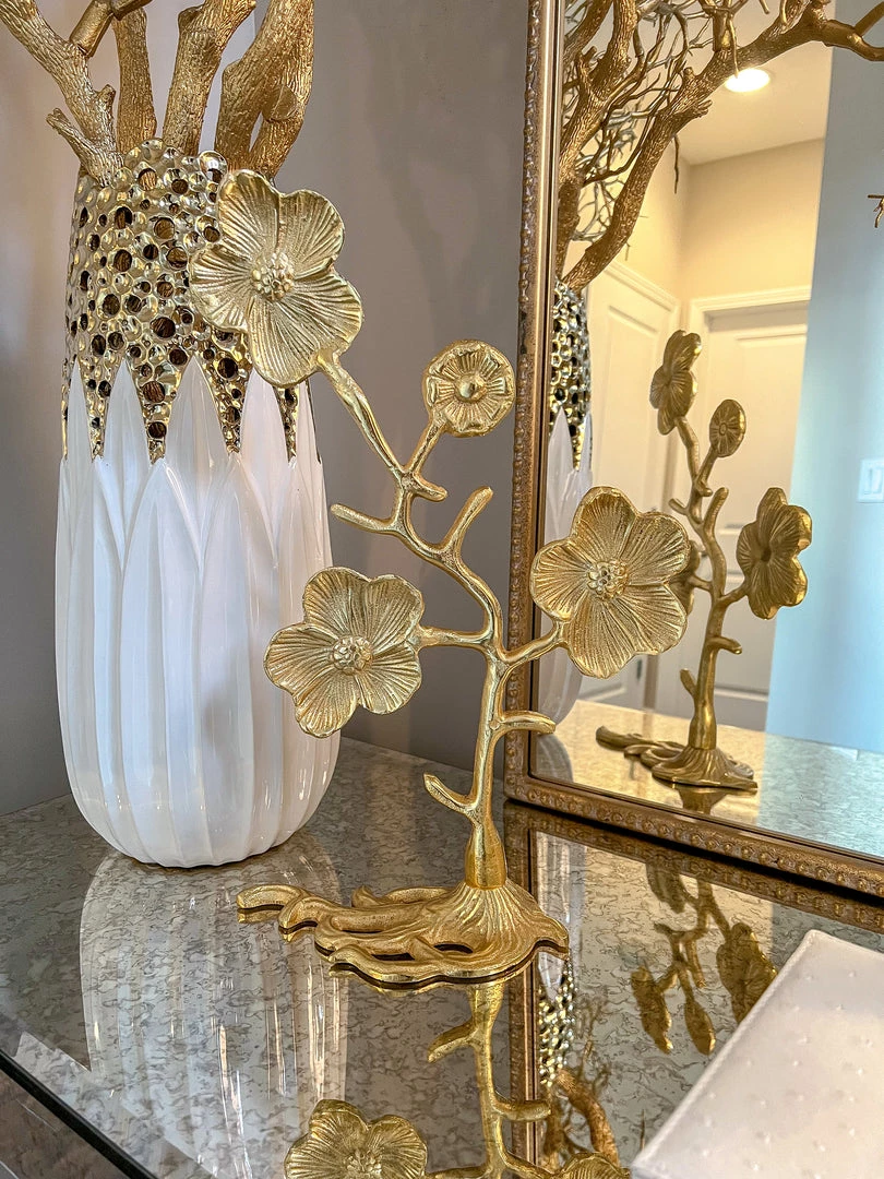 Description: This stunning gold floral decor is great to add extra height to your vignette! Standing at 15.5″ high, the silhouette on this piece is absolutely striking!