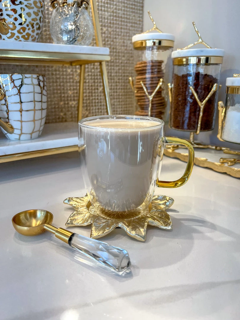 Description: This stunning double wall mug is glamorous simplicity! It is perfect for holding warm or gold drinks and features a fun gold flare on the handle.