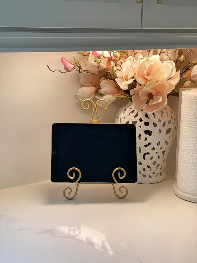 Description: This golden easel is a great way to prop up your items in style! Functional for books, electronic tablets, papers, and more!