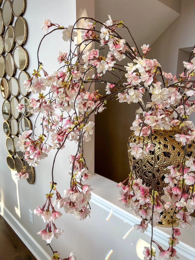 Description: This hanging cherry blossom stem is the perfect accent for your holiday display! Perfect for a tall vase in an entryway and can be used year round!