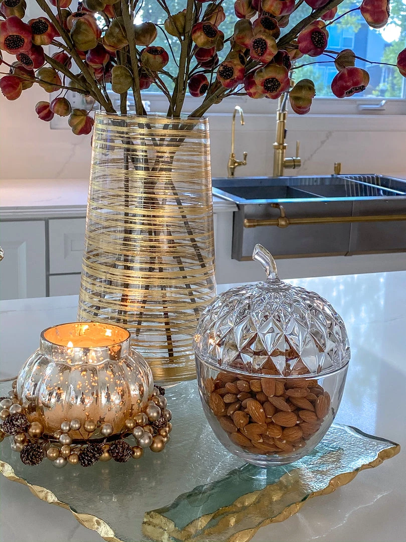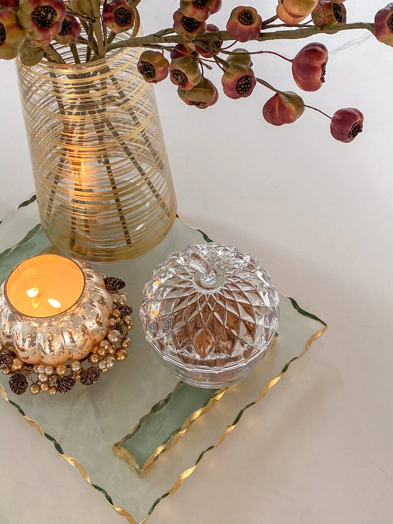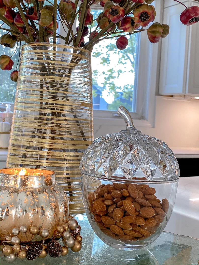 This glass acorn dish is perfect your you kitchen island or any side table! Fill it with your favorite small snacks for the cutest addition to your fall decor.