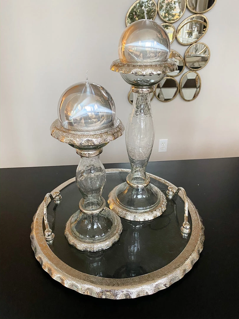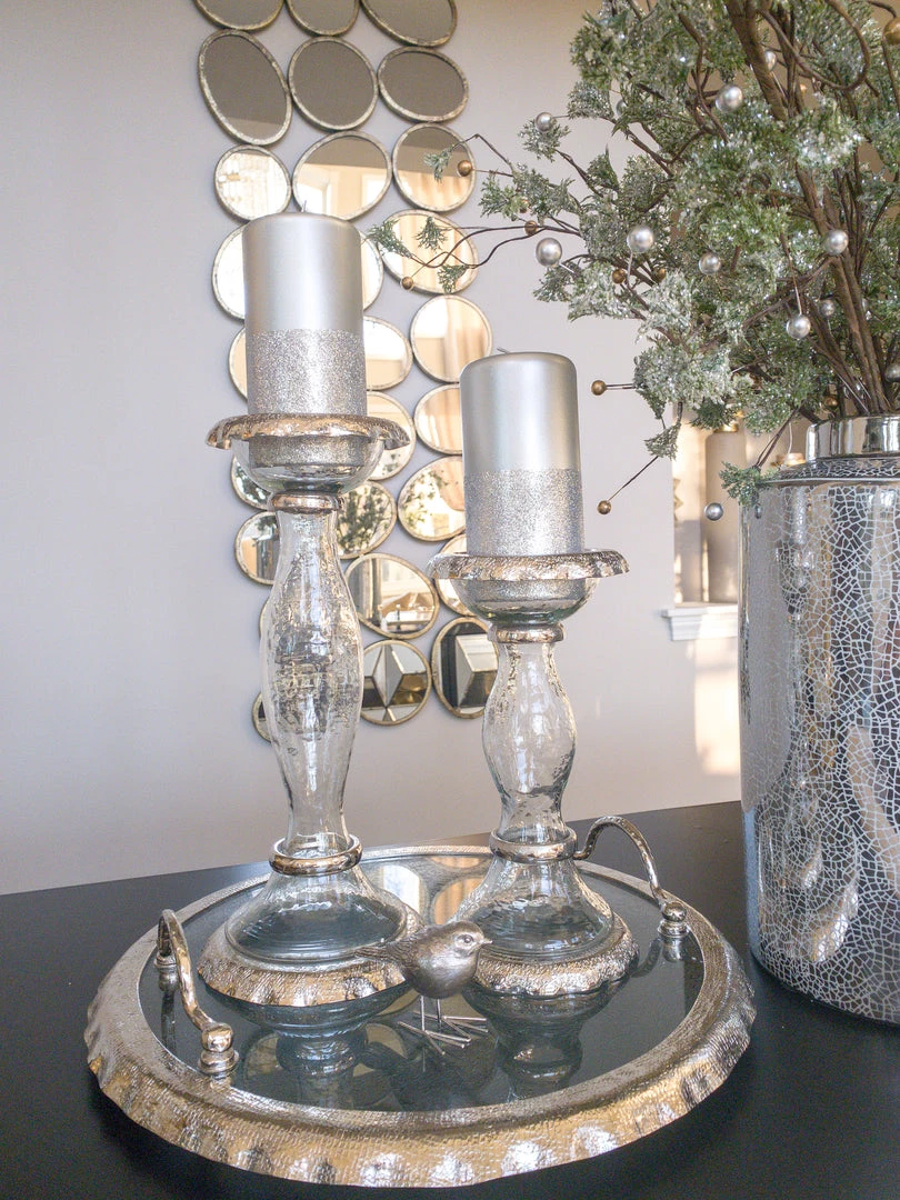 These glass candle holders feature stunning silver ruffled metal for an elegant look all year round.