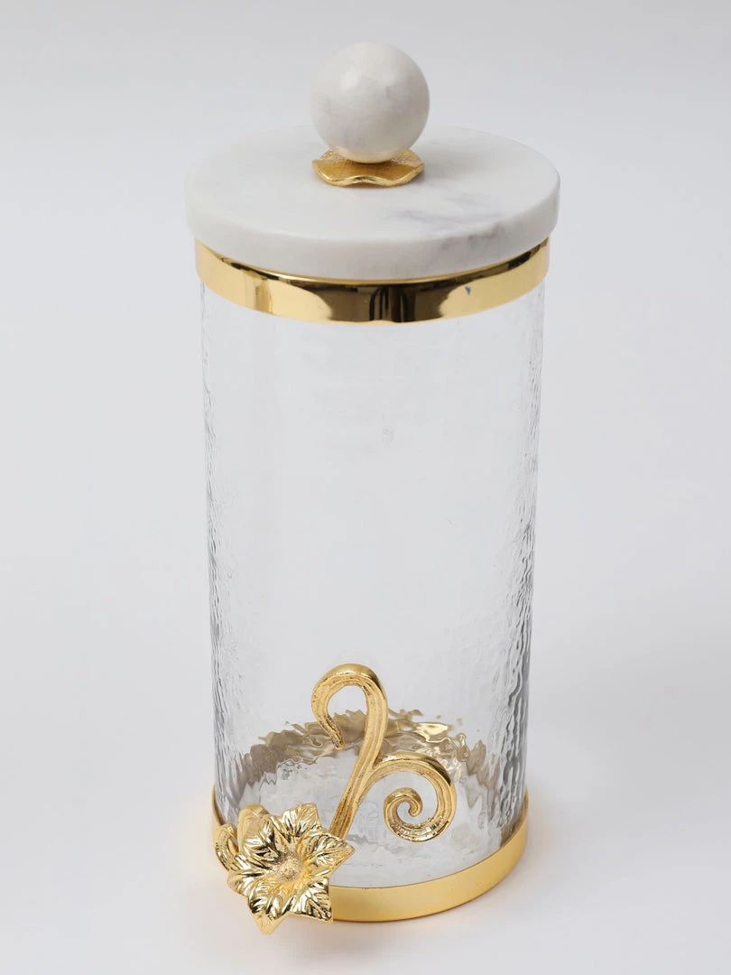 Description: These beautiful glass canisters have a golden flower design and a marble top with a gold accent. What a stunning way to showcase on your coffee station, kitchen counter, or anywhere you need storage. These would look fabulous in your bathroom as well.
