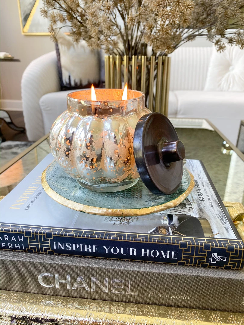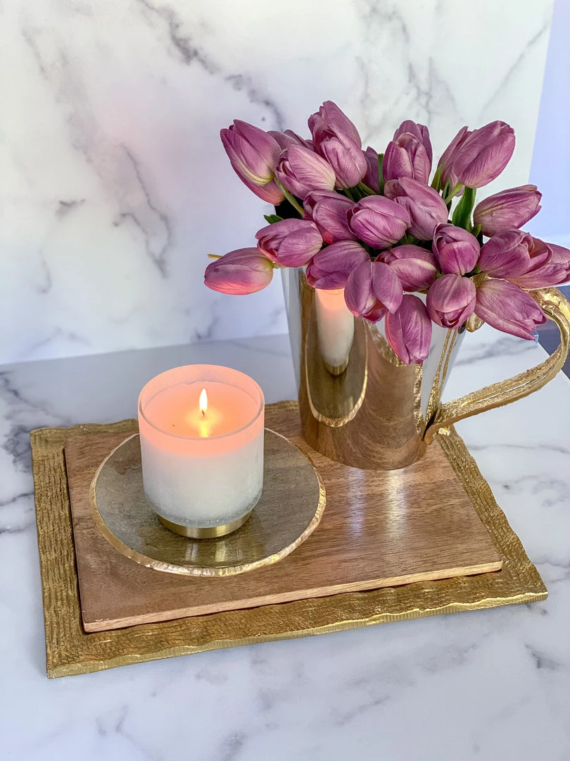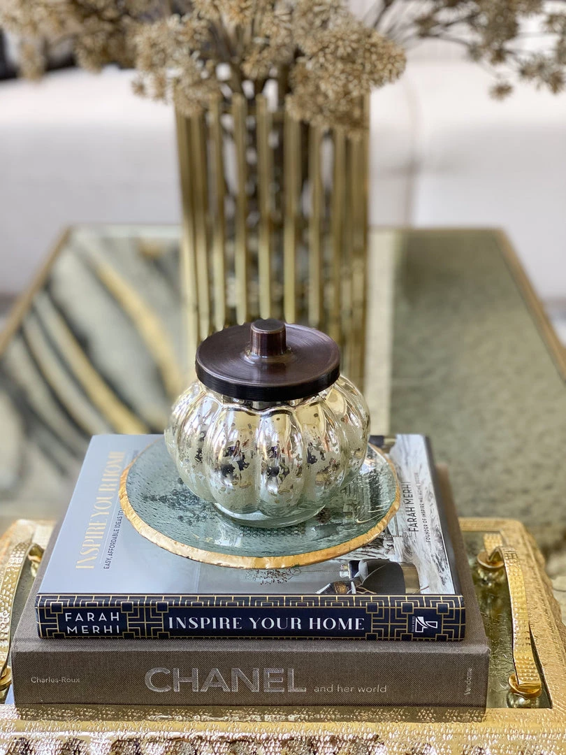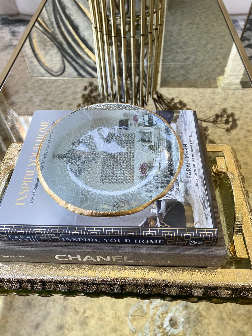 This glass plate with gold edge can be used as a dessert plate, or used to style your favorite candle on!