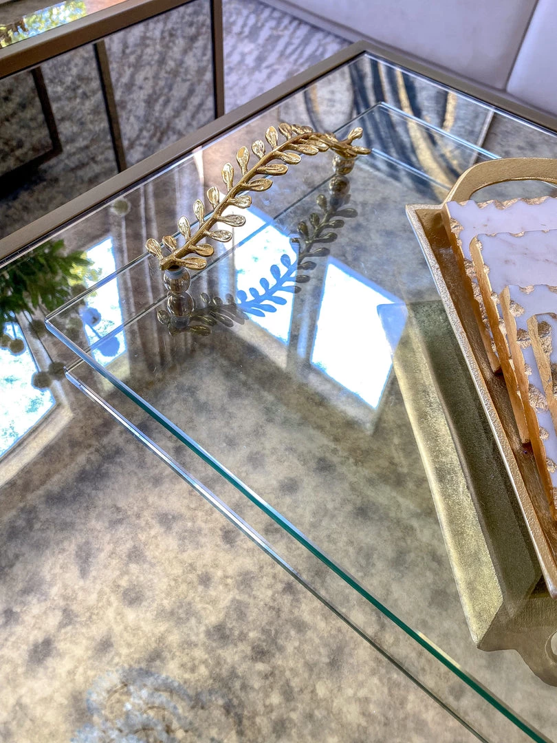 Description: This substantial glass tray features beautiful metal handles with a unique vine pattern.