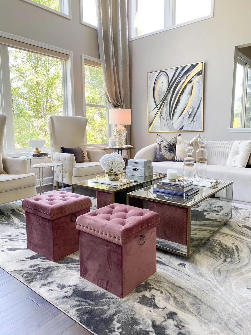 The Inspire Me! Home Décor Anastasia Ottoman features soft tufted velvet upholstery and is extremely versatile in its functionality. It provides comfortable seating for your family members and guests and allows items to be stored neatly inside simultaneously. You can also use it as a foot rest. It provides a good amount of space for hidden storage. Great for shoes, small toys, remotes, wires, and so much more. Featuring metal studs and handle detailing in brushed brass, it instantly adds a luxurious touch to your home. Use it in the entryway to sit down while you slip on your shoes in the morning, place it in your living room for extra seating, or use it in your bedroom as a beautiful accent piece. This ottoman assembles in just a few seconds and no tools are needed, so you can put it to use right away without worry. Moreover, it folds flat when not in use. Fantastic for your own space and also great as a housewarming gift because of its versatility and usefulness.