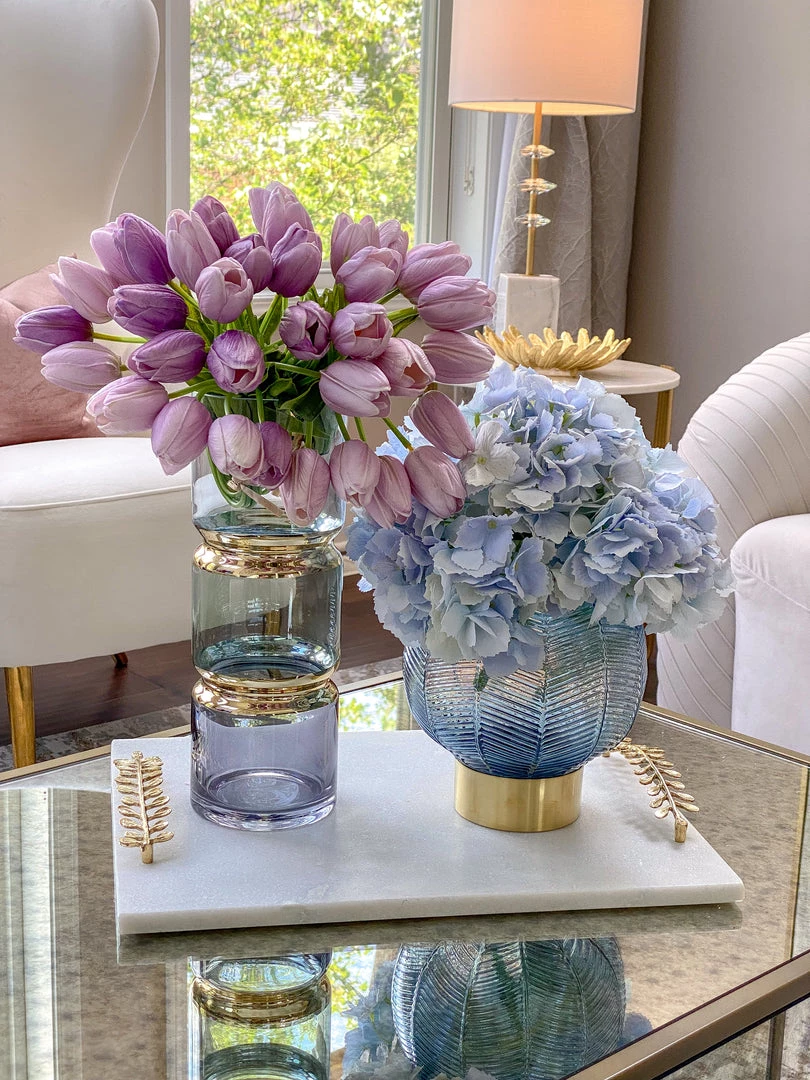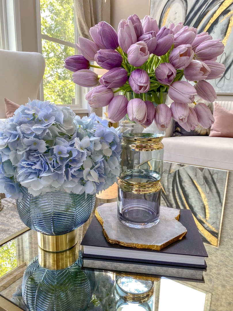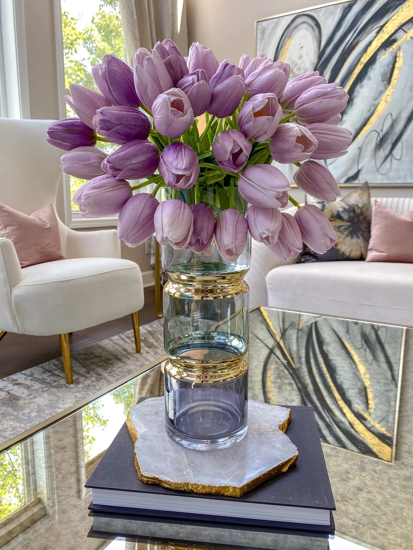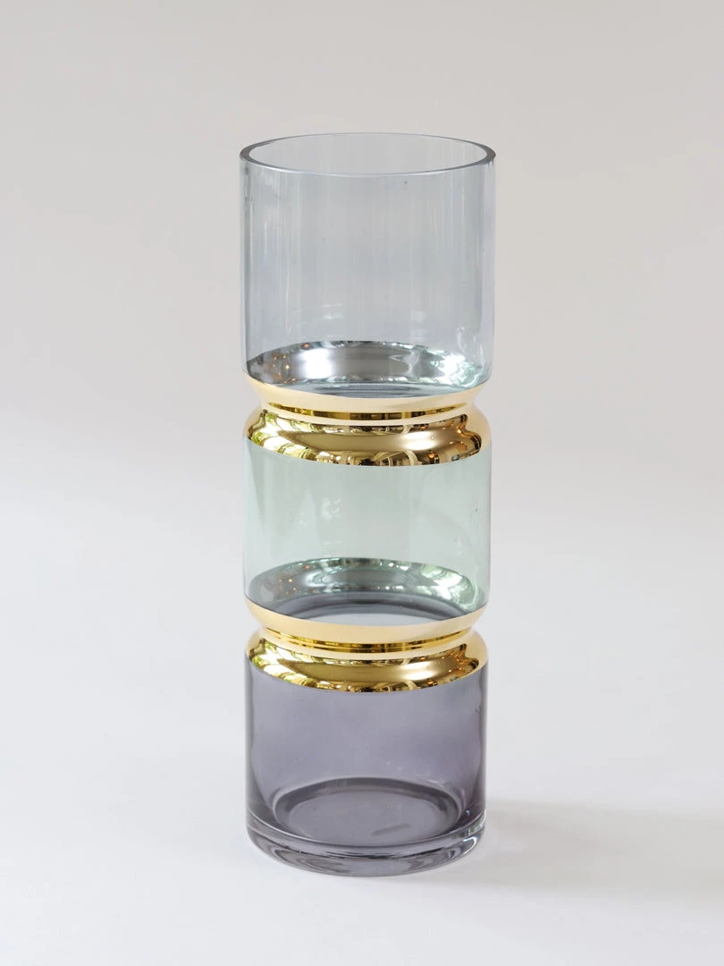 Description: This beautiful vase features beautifully segmented colors with a gold band design! Perfect for those summer florals!