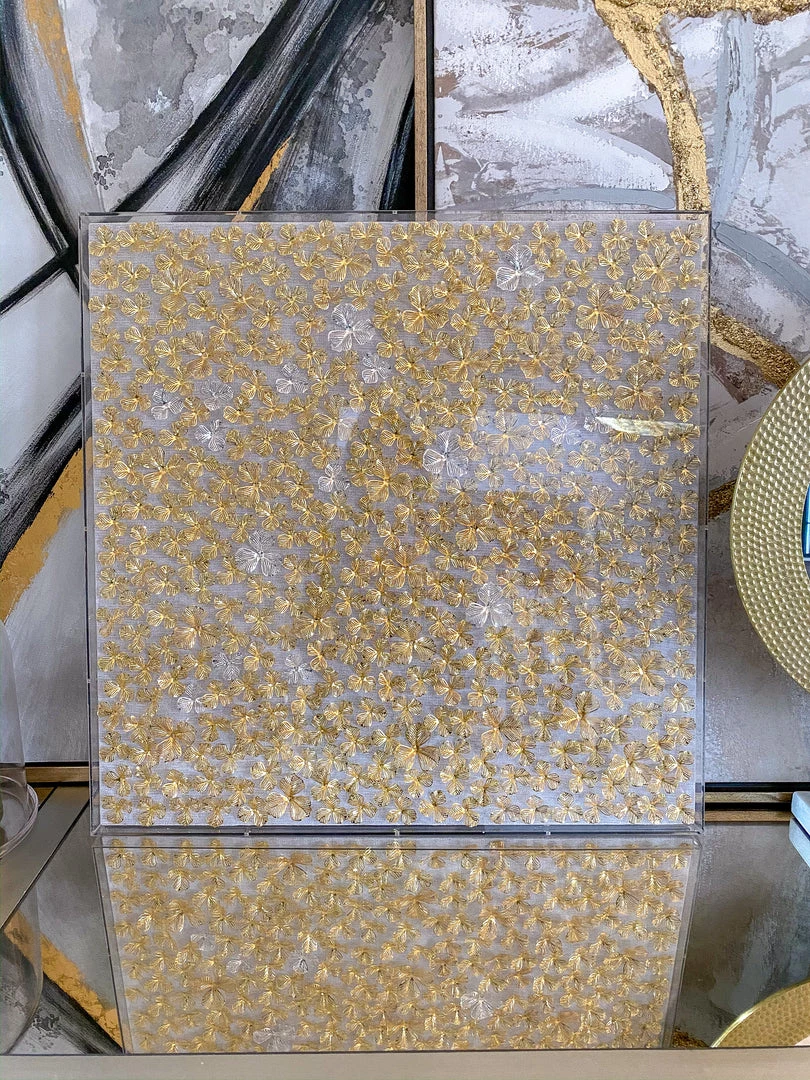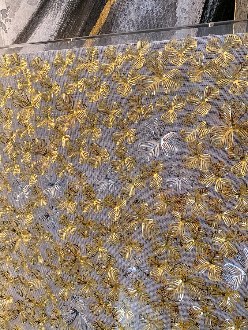 Description: This intricate wall art features different-sized silver and gold metal flowers spread across the piece encased in a clear covering. This is a fun and glamorous way to decorate your home office or any other space in your home!