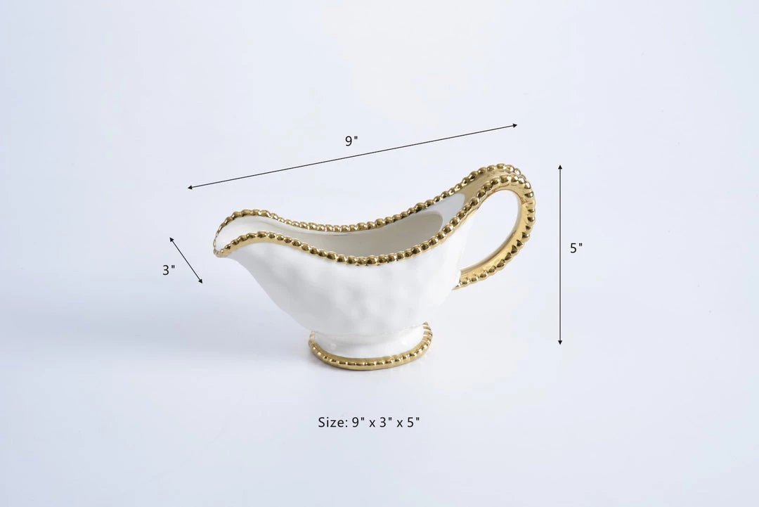 Description: This high-quality porcelain is a miracle material! It is food-safe, dishwasher safe, and oven safe up to 350 degrees! Made in Argentina, this beautiful porcelain is also tarnish-free, scratch/stain resistant, will not lose its beautiful luster, and is perfect for everyday life! Baking and serving never looked so good! This piece is an IMHD favorite! We love this detailed gravy boat. Use this to pour gravy, sauce, or anything else you can think of! We love the gold beading on the edges and the texture on the white surface.