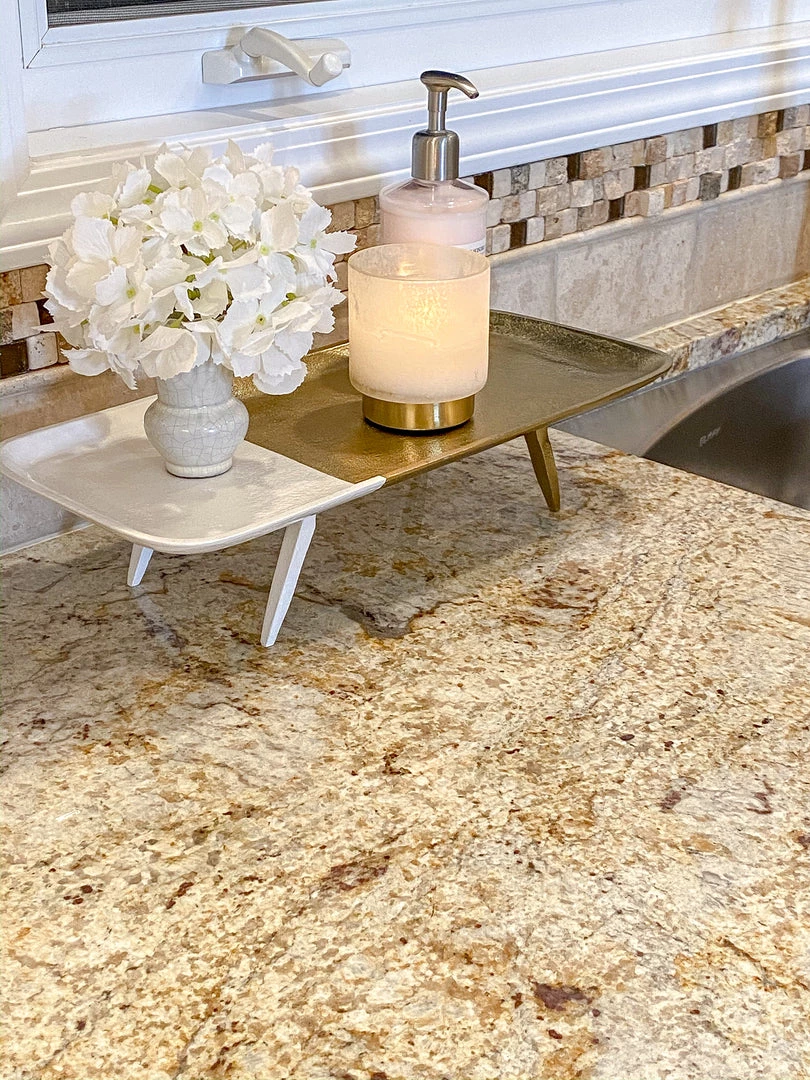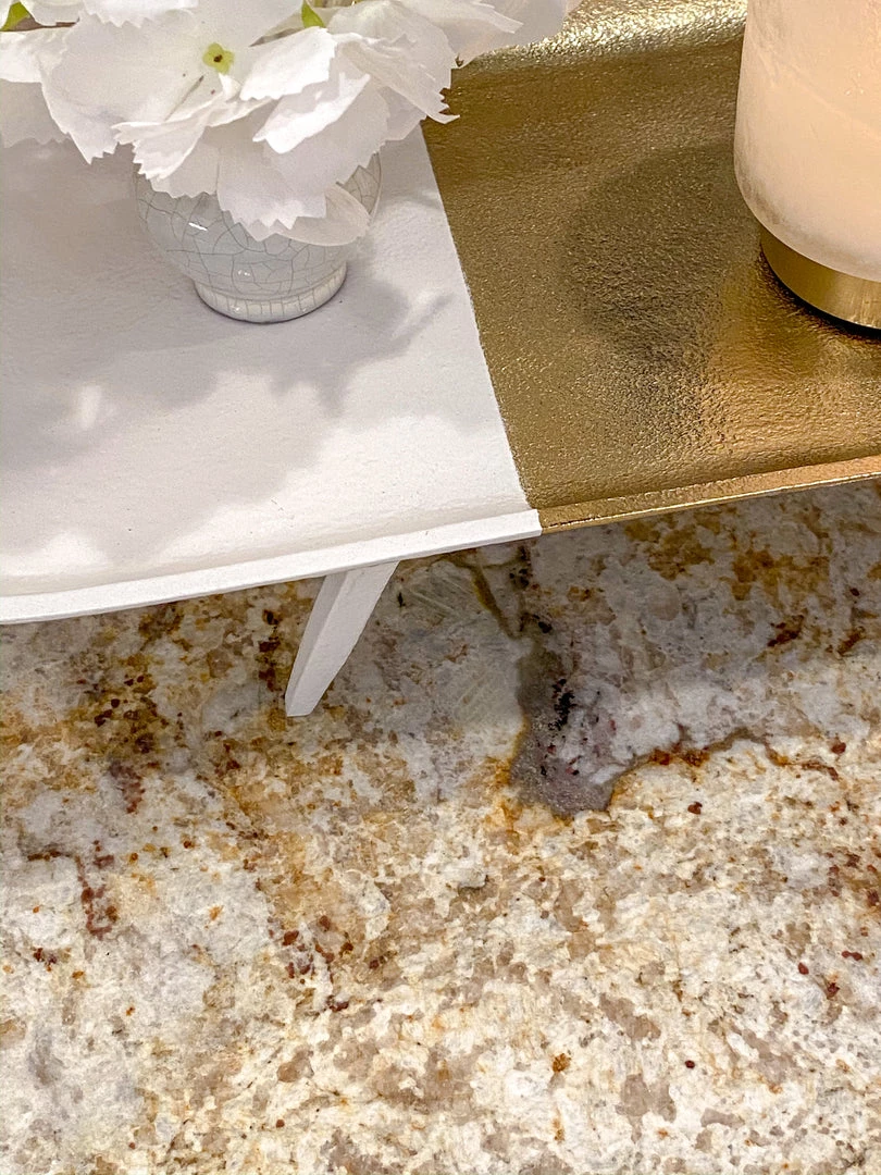 This gold and white stand is an elegant way to style your decor on it for added height but also a unique way to serve food and dessert!Â