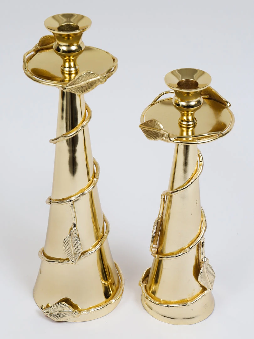 Description: These gold detailed candle holders are a beautiful addition to your coffee table or credenza! Style them anywhere in your home with some taper candles and they will bring a glam look to the room!
