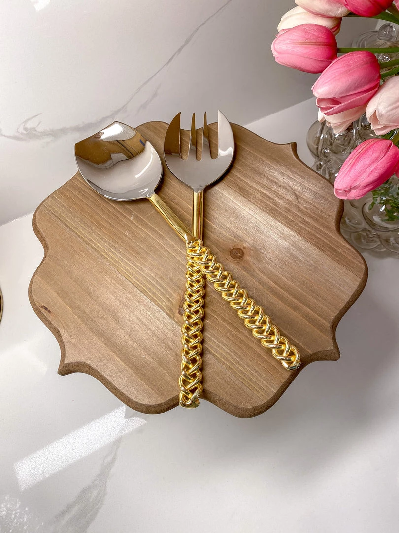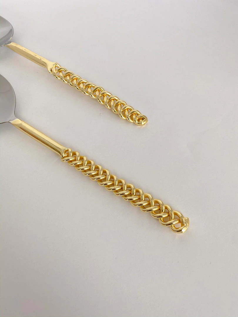 Description: Add some texture to your serving decor with these two-toned gold chain salad servers! These pieces are stunning modern additions to your glam decor!