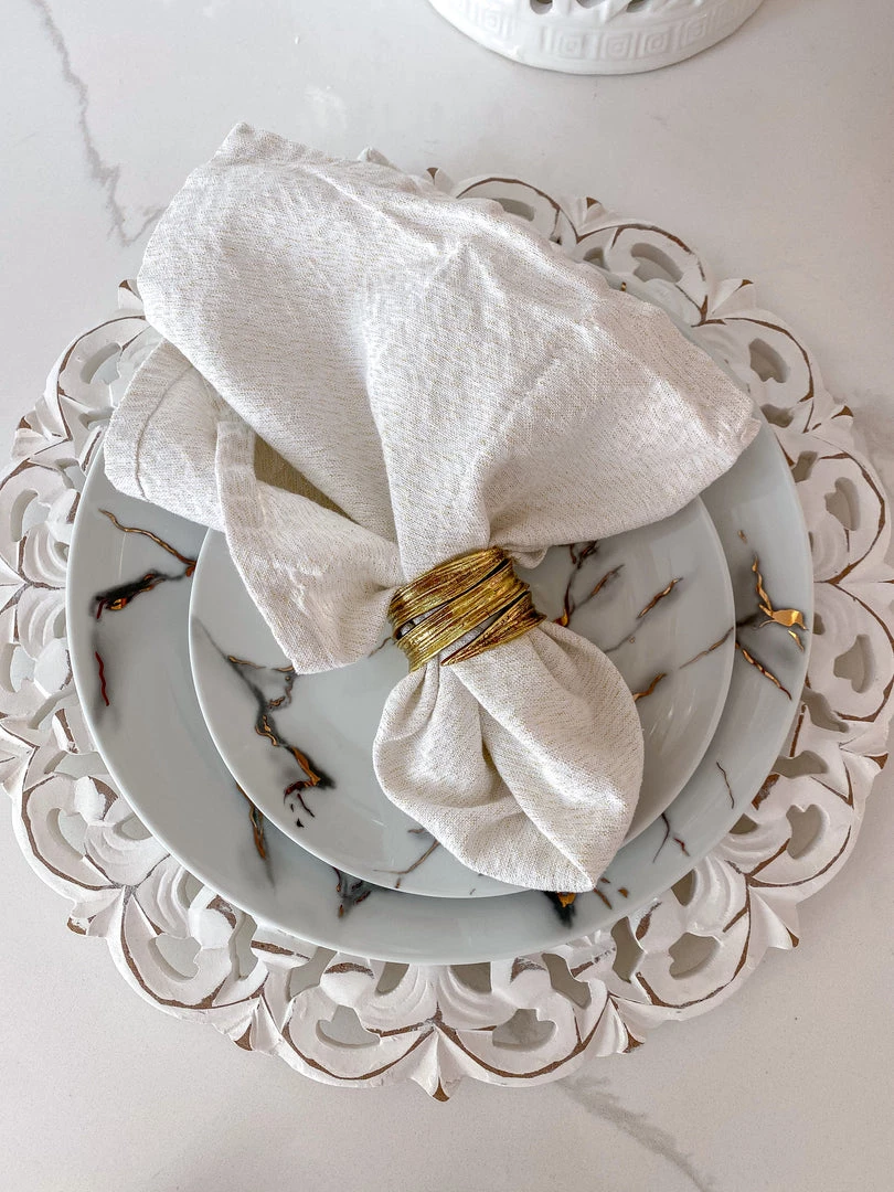 Description: These napkin rings are beautiful metallic gold and will match perfectly with your chargers and napkins.