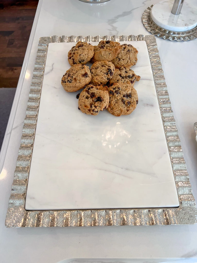 Description: This large beautiful marble tray features beautiful rippled edges. Use it to style your decor or your coffee station elegantly!