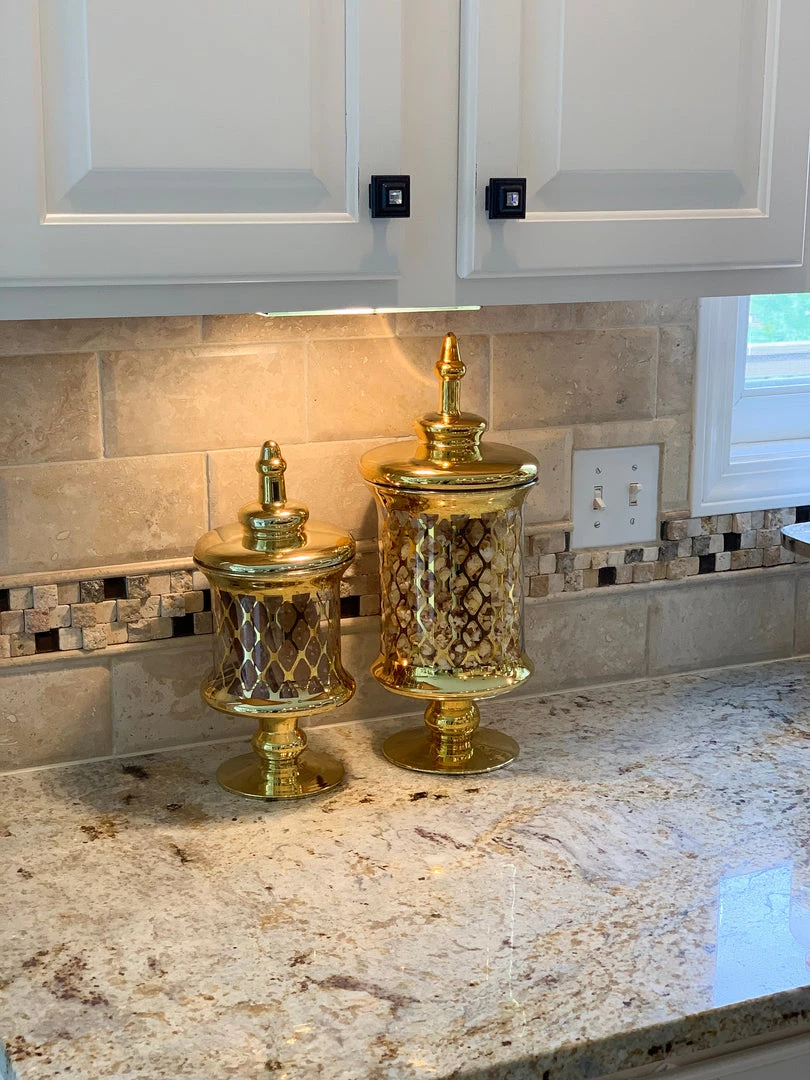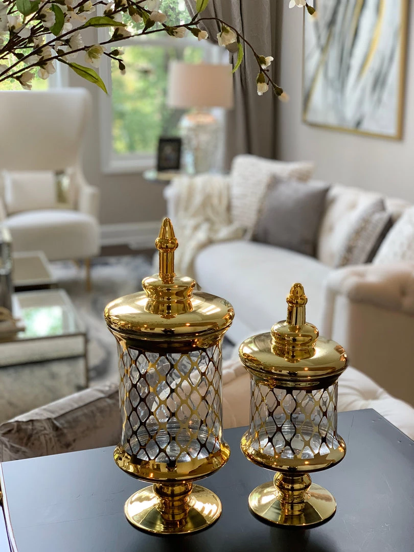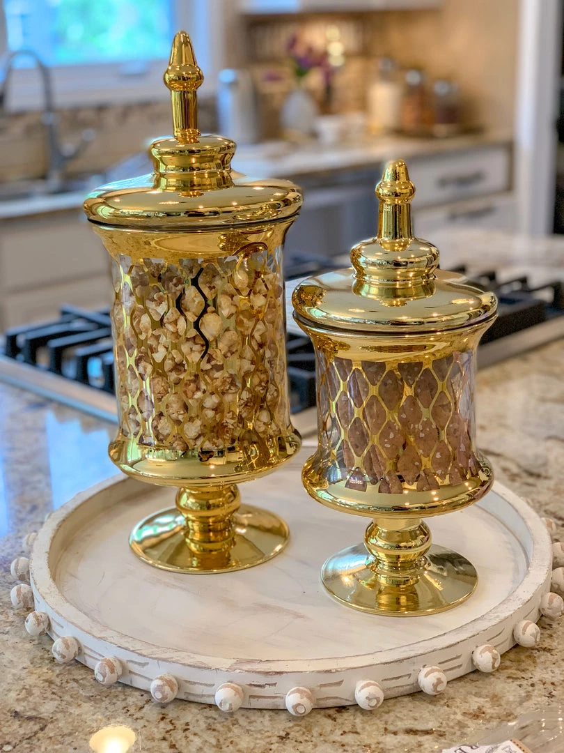 This uniquely shaped gold apothecary jar can be used to store flour, candies, or even as a vase!