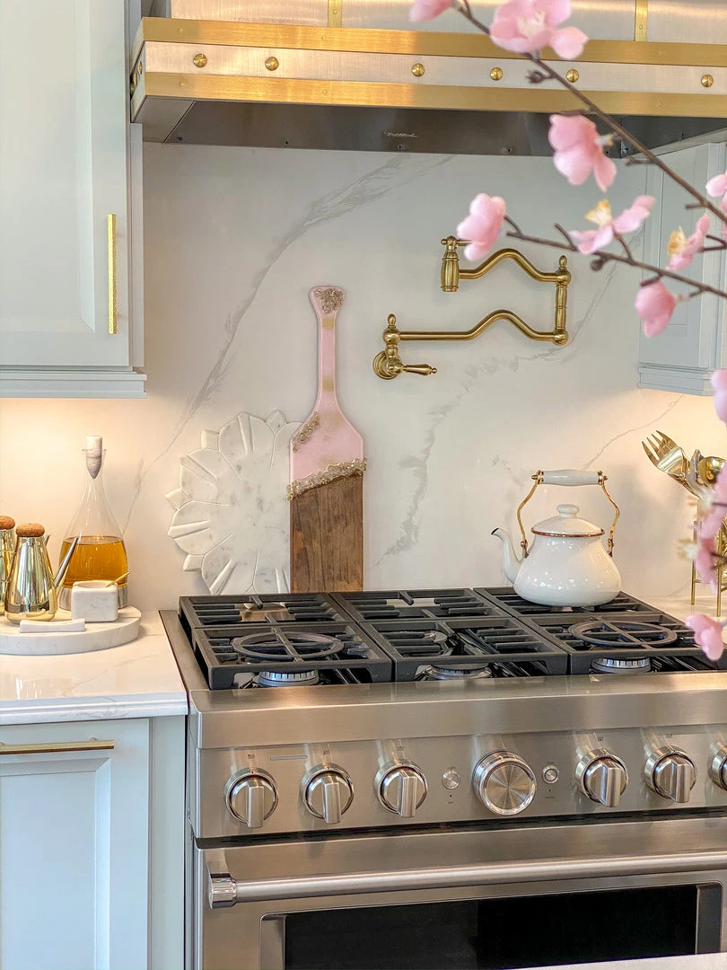 Description: This wooden paddle serving board will add unique elegance to your serving display! Each piece is handmade with a glossy resin finish featuring gold and pink colors, and encrusted with clear shimmering stones.