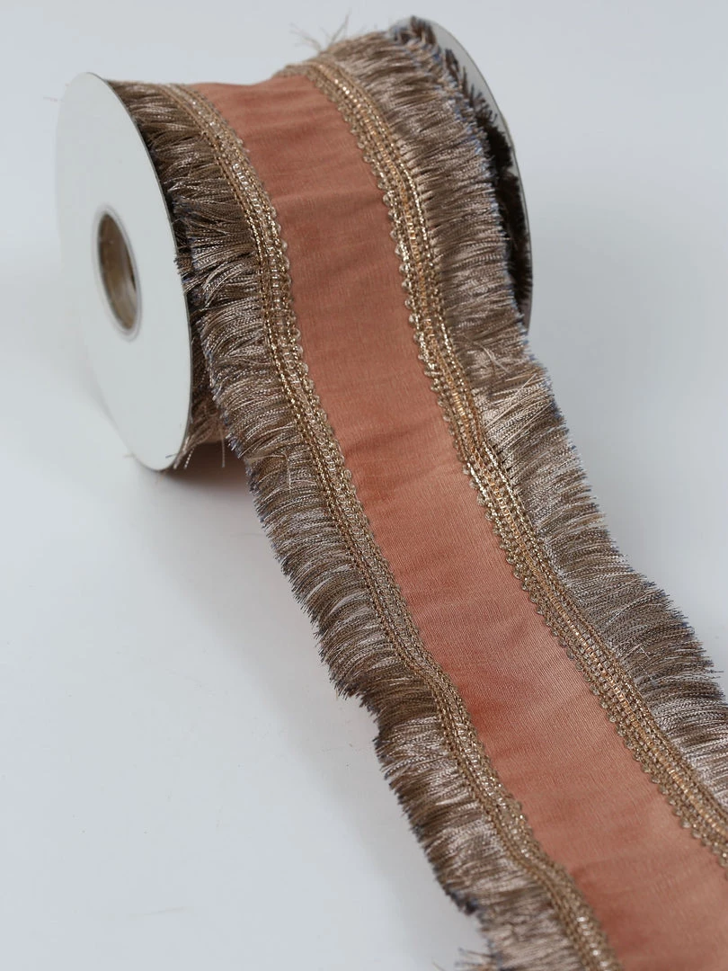 Description: Mauve and gold fringe ribbon. This ribbon is multifunctional! Can be used for wrapping or placed on top of a table runner!!