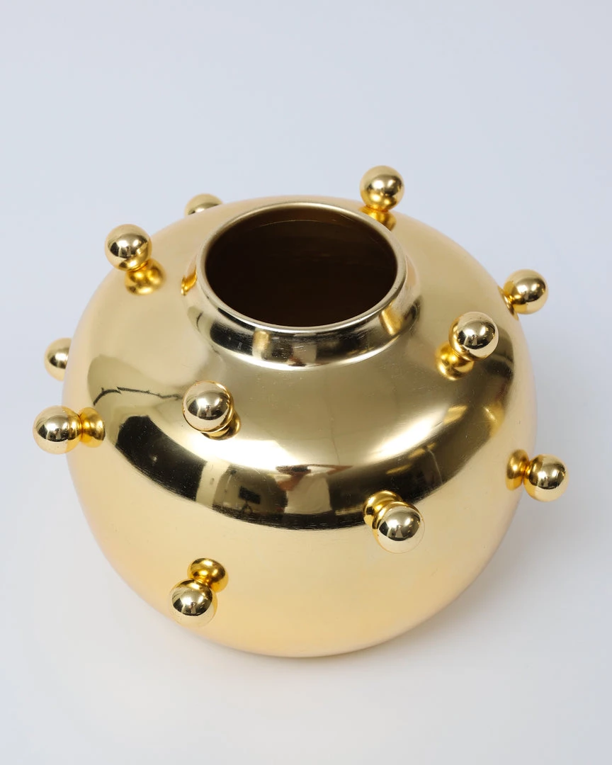 Description: This unique metal-studded gold vase is sure to attract attention. Fill with your favorite faux florals and make a statement in any room!
