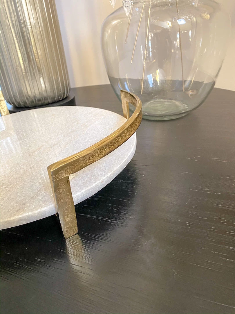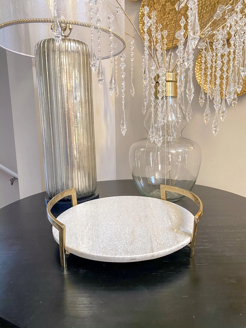 This awesome marble and metal tray features sturdy metal handles with a modern transitional flare and a beautiful round marble slab to hold your favorite pieces.