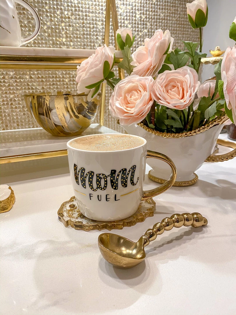 Description: For all our moms on the go! You can always use a little more Mom Fuel! The gold handle adds an extra touch of elegance that we love!