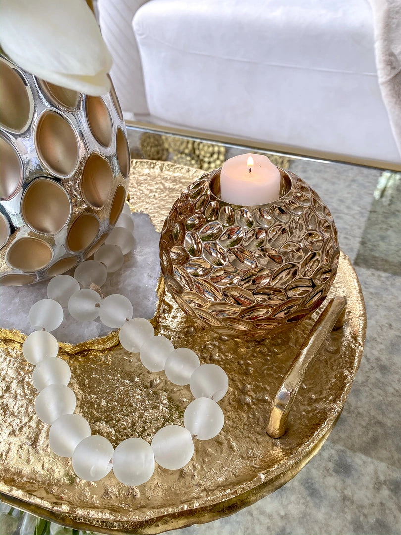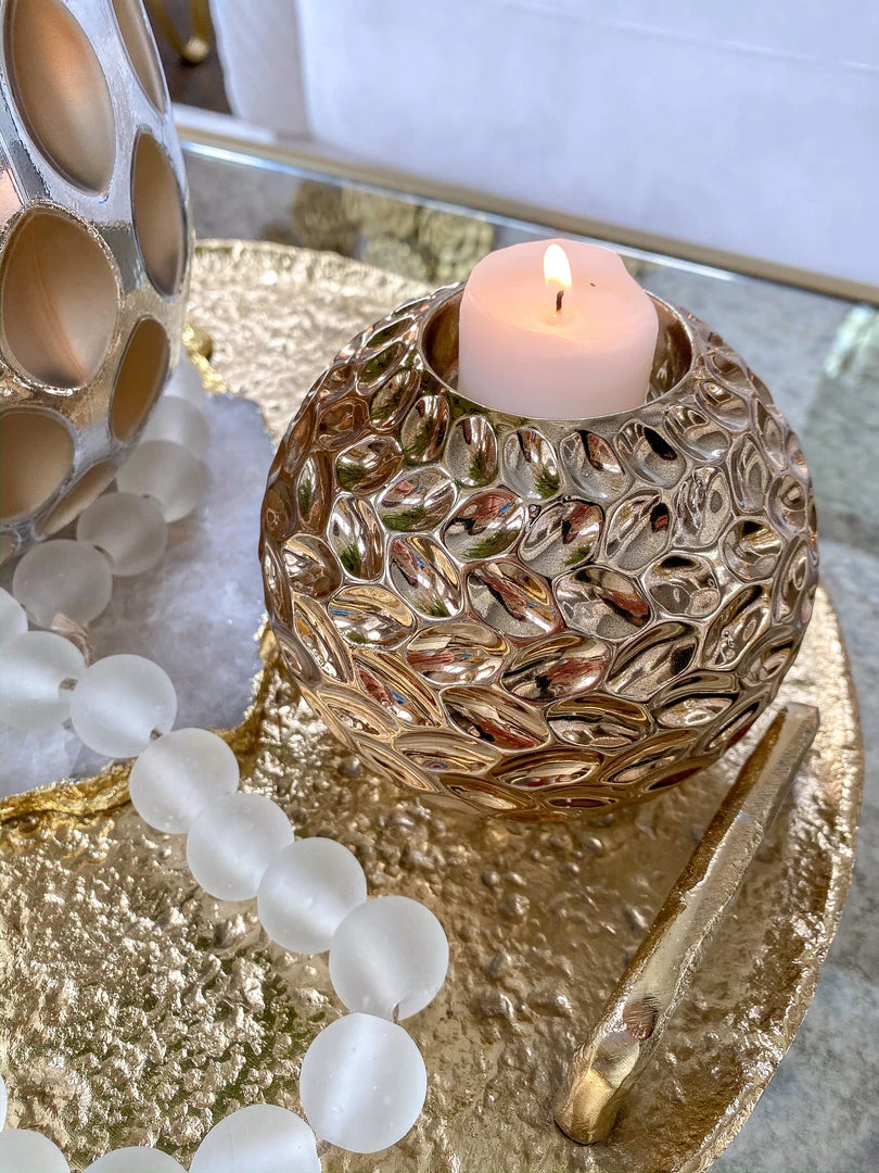 Description: This gold orb tealight holder is such a unique piece, It will bring a fun shape to any vingette and would look great on a tray on your coffee table!