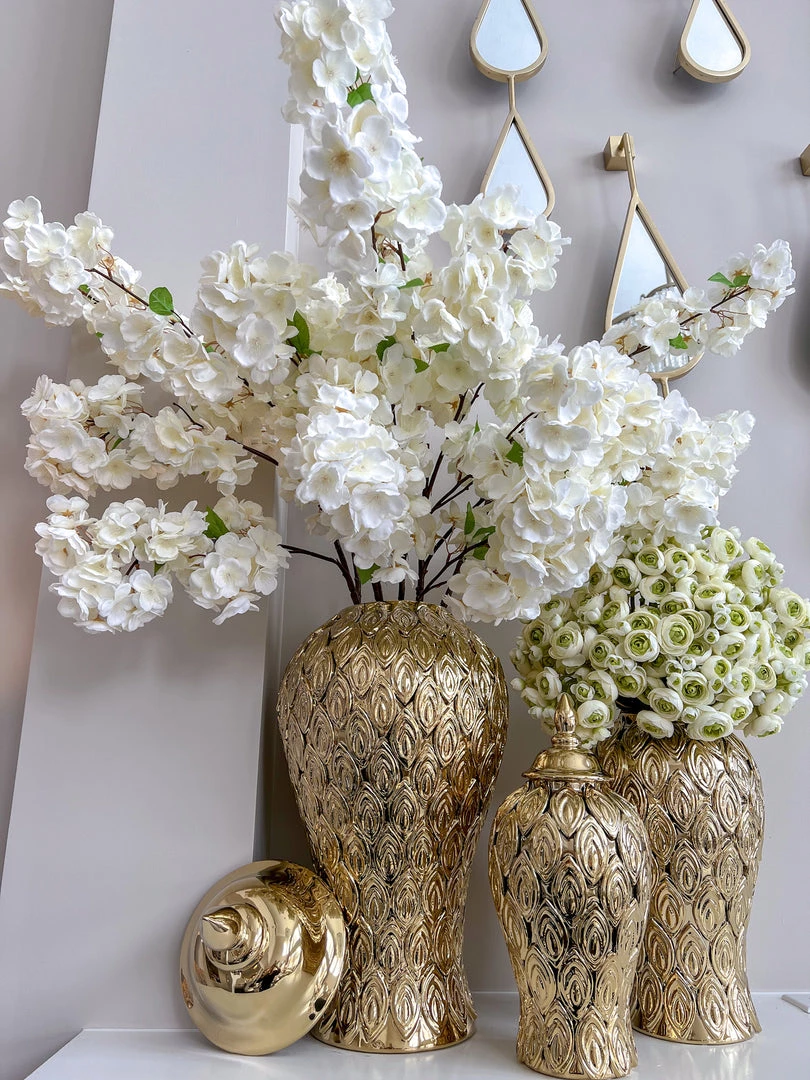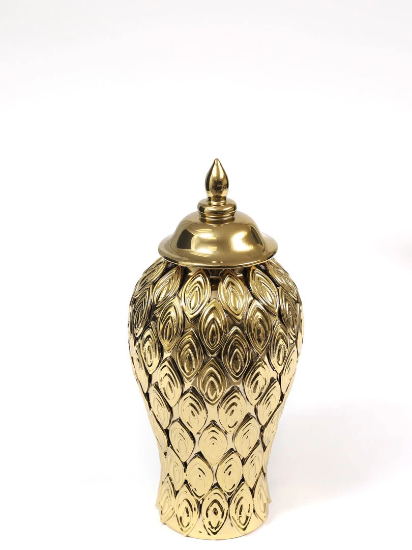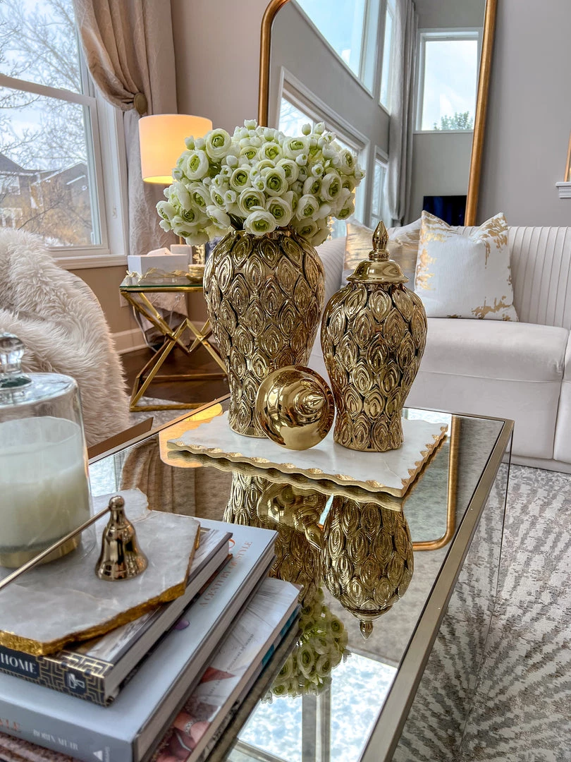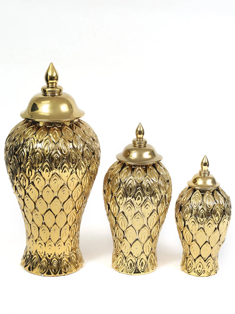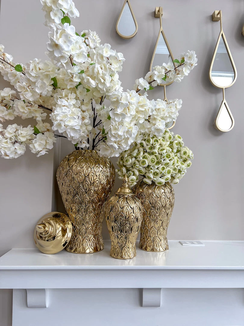 These ginger jars are absolutely stunning! The gold petal texture adds a luxurious touch to my living room. I bought all three sizes, and they look perfect together. Highly recommend!