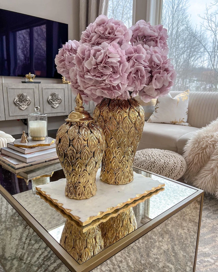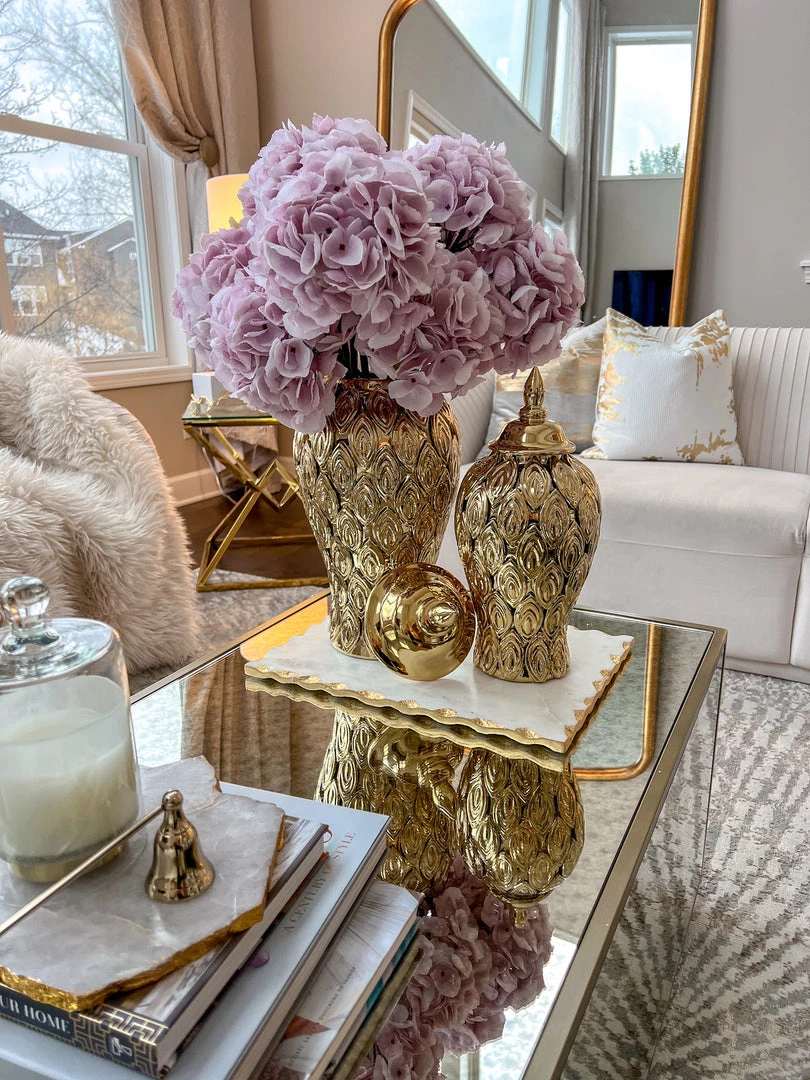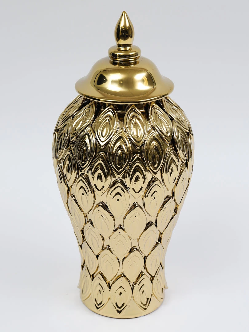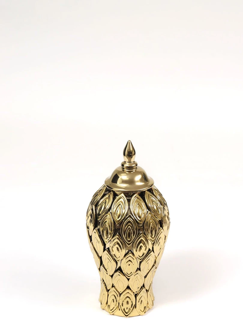 These ginger jars are absolutely stunning! The gold petal texture adds a luxurious touch to my living room. I bought all three sizes, and they look perfect together. Highly recommend!