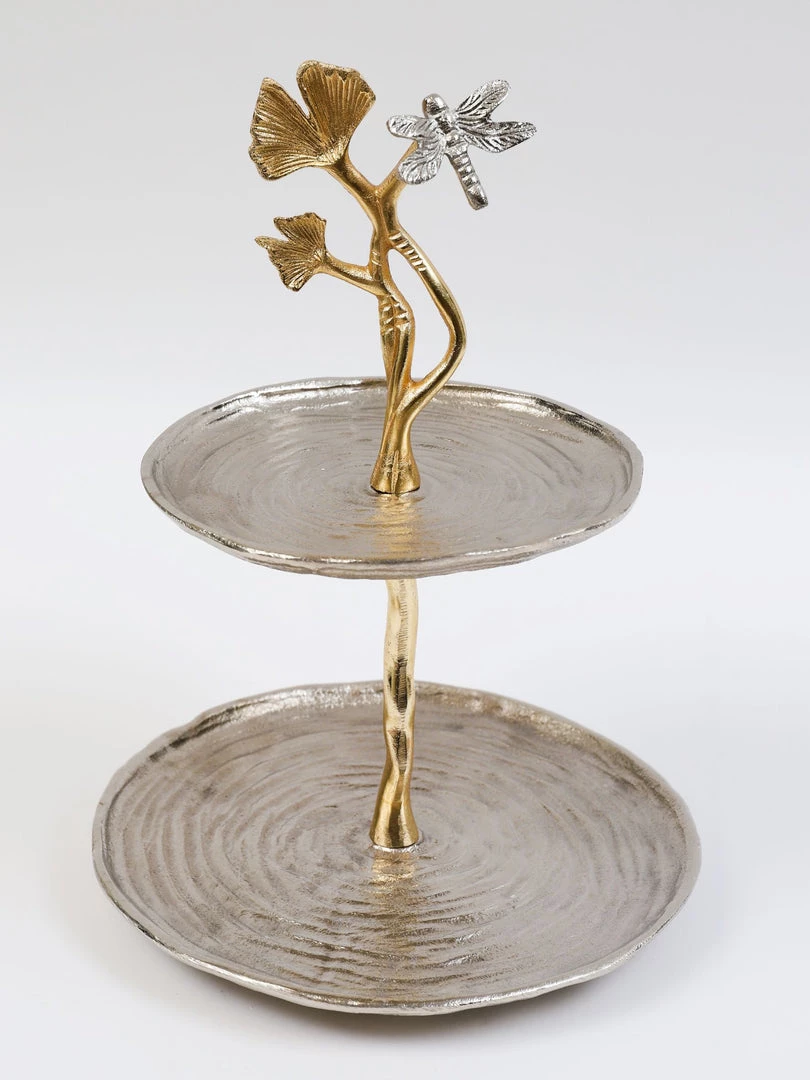 Description: This beautiful cake stand brings the elegance of nature into your home! The two-tone design will match any home decor, perfect for our gold and silver lovers! And the beautiful details and delicate dragonfly makes for a perfect accent piece!