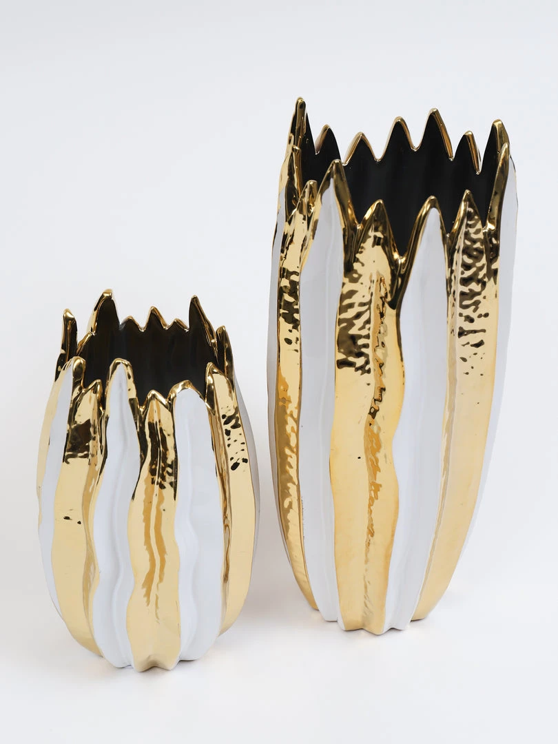 Description: This gold and white striped vase is very detailed at the top and looks absolutely amazing with any color faux floral!
