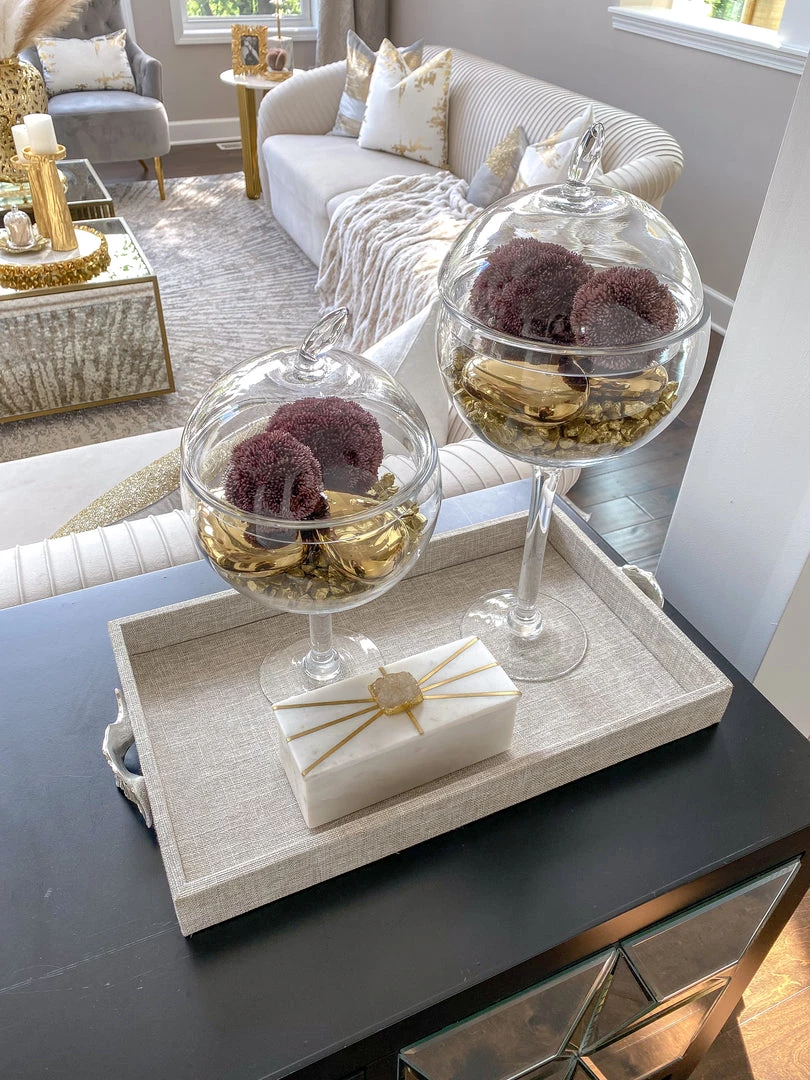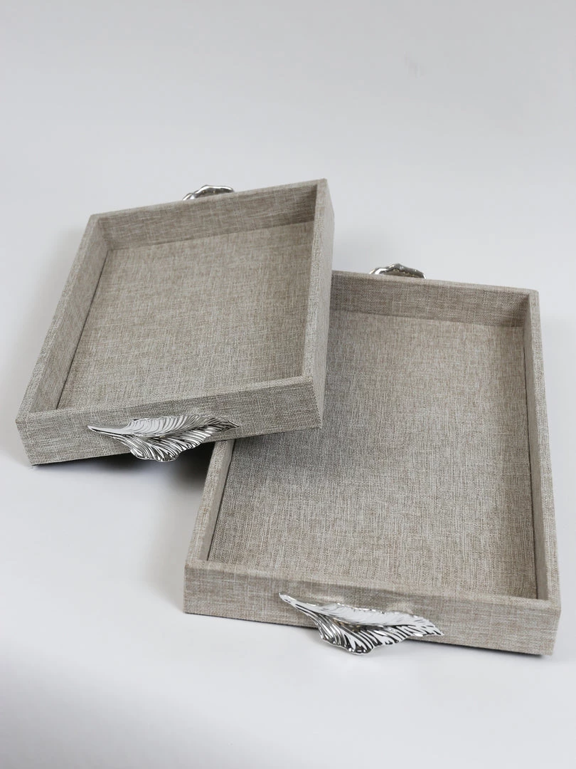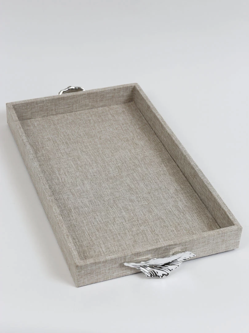 Description: This stunning fabric colored tray features a shiny silver handle and comes in two different sizes! We love to mix and match them with our favorite layering pieces.