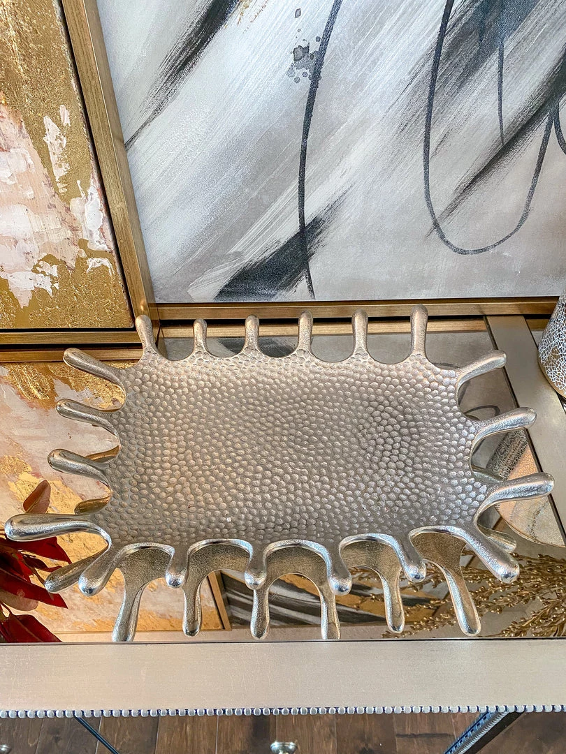 Description: This stylish tray features a unique splash design! Perfect to add a fun touch to your vignette! Available in silver and gold.