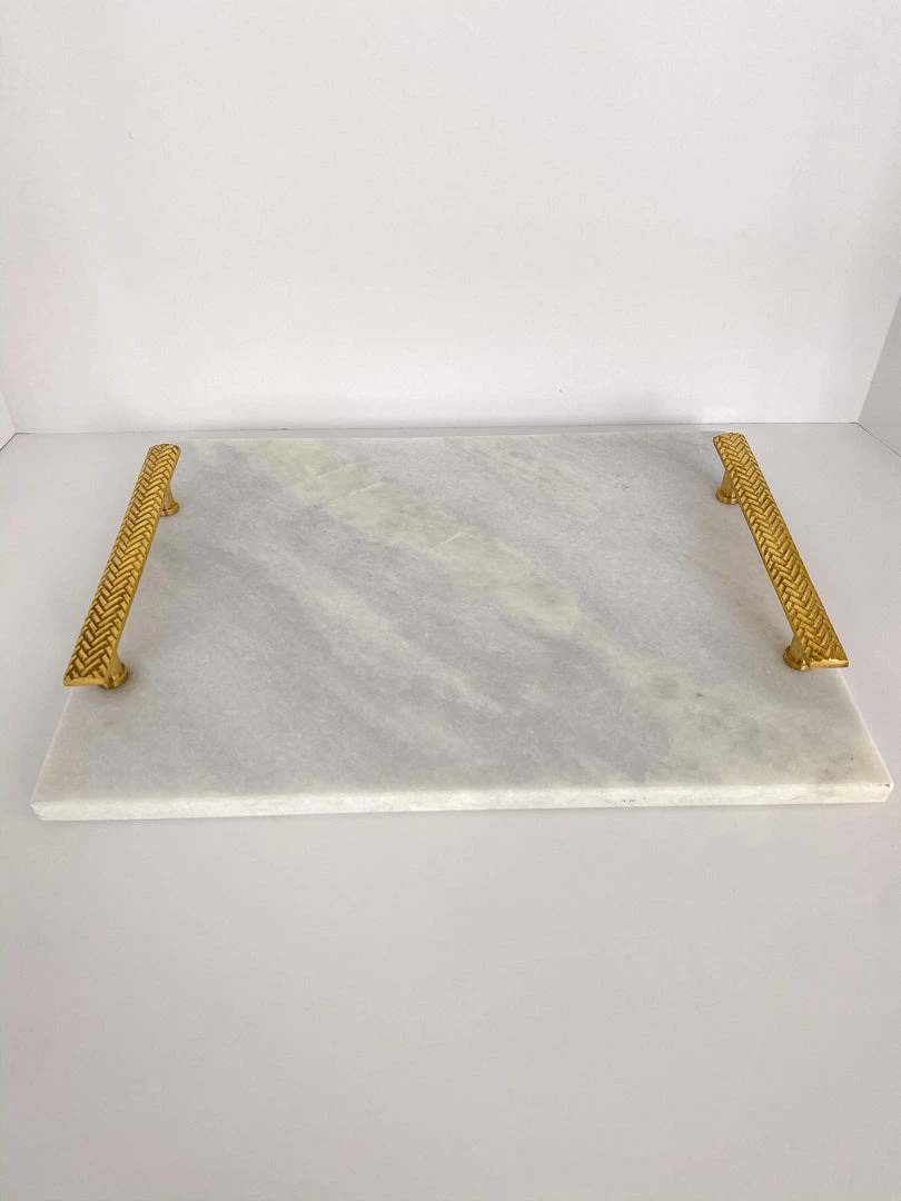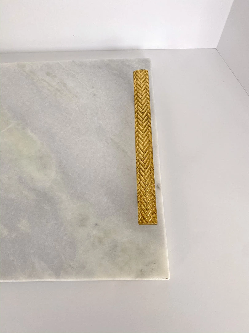 Description: Serve your guests in style with this beautiful herringbone marble tray! Featuring gold handles and a matching serving knife, this piece is functional as well as stunning!