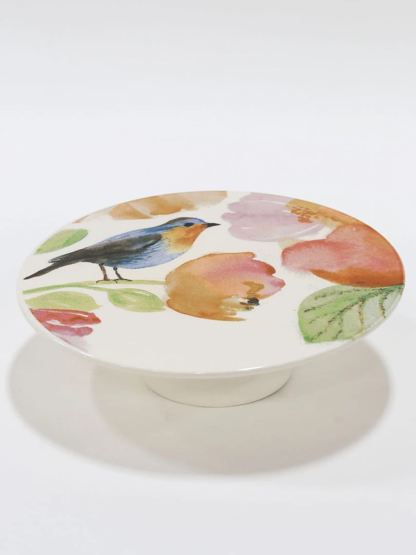 Description: This stunning cake stand is perfect for spring! We love the bright floral colors and the adorable little bird centered in the image. Pefect for a kitchen or bath display!