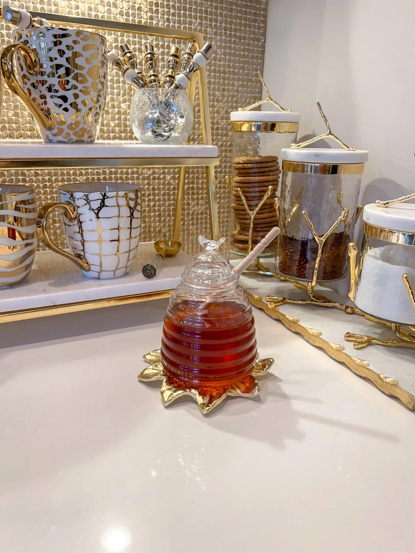 Description: This beautiful glass honey jar is so elegant and whimsical! Celebrate the natural beauty of the beehive and the sweet honey they produce! Don’t forget to check out our Gold Bee Tea Spoon to complete this look!