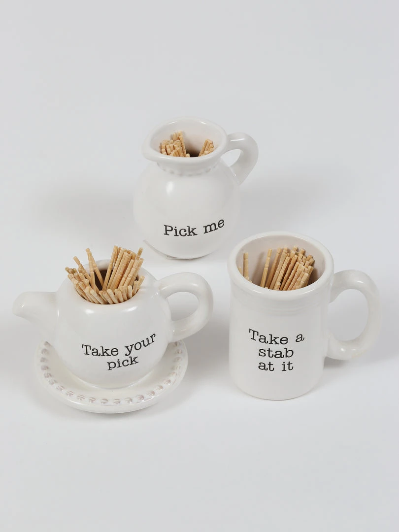 Description: These unique toothpick holders are absolutely adorable! Each item is complete with its own unique phrase and shape that offers a fun and whimsical touch to uyour serving decor. Available in 3 shapes, each sold seperately.