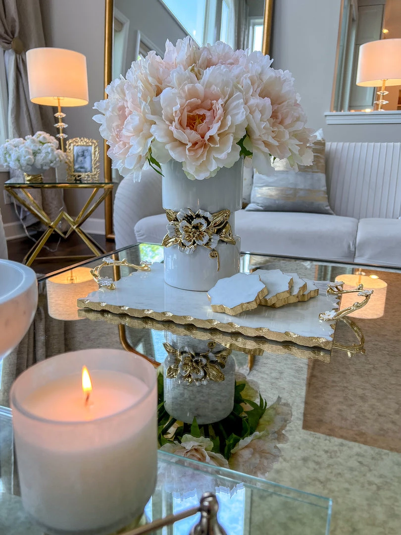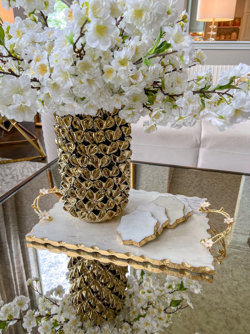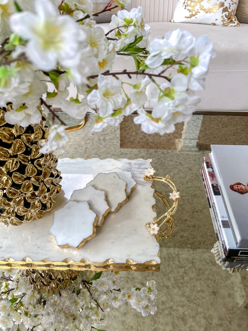 Description: This large rectangular marble tray has stunning gold detail and gold handles with a cherry blossom design!