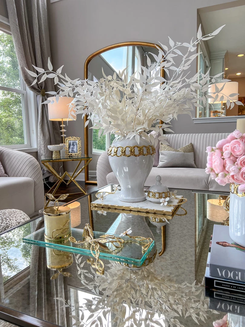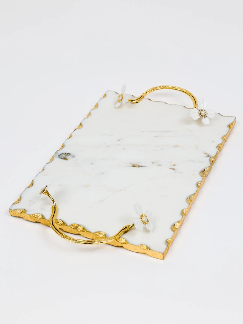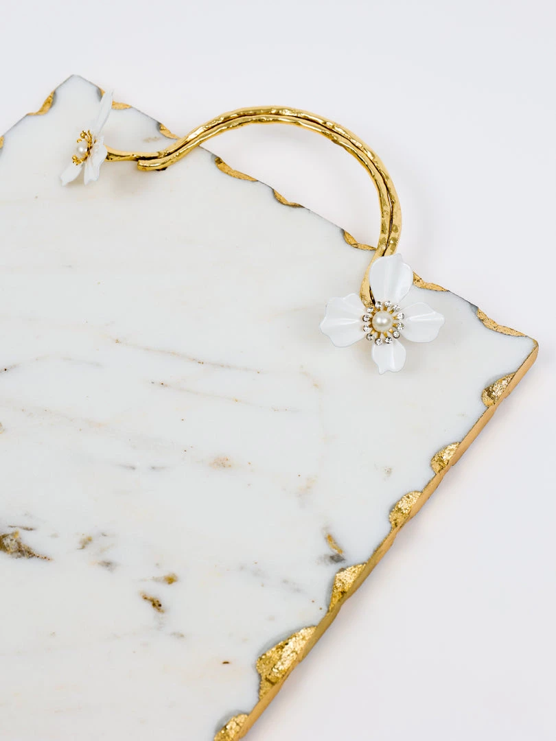 Description: This beautiful rectangular marble tray has stunning gold details with a white jeweled flower design!