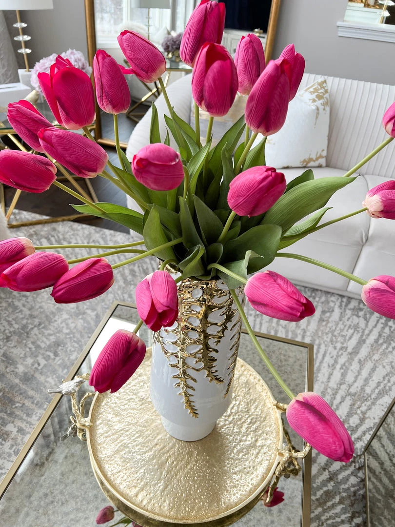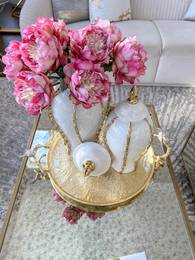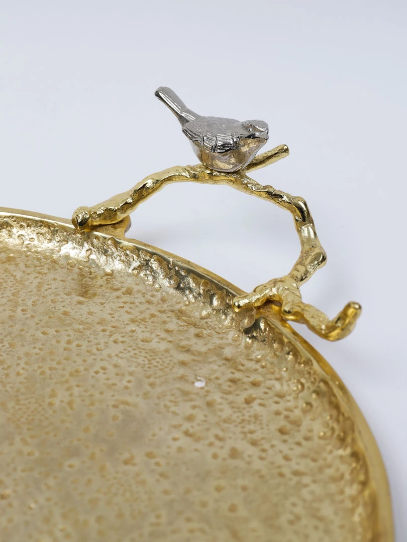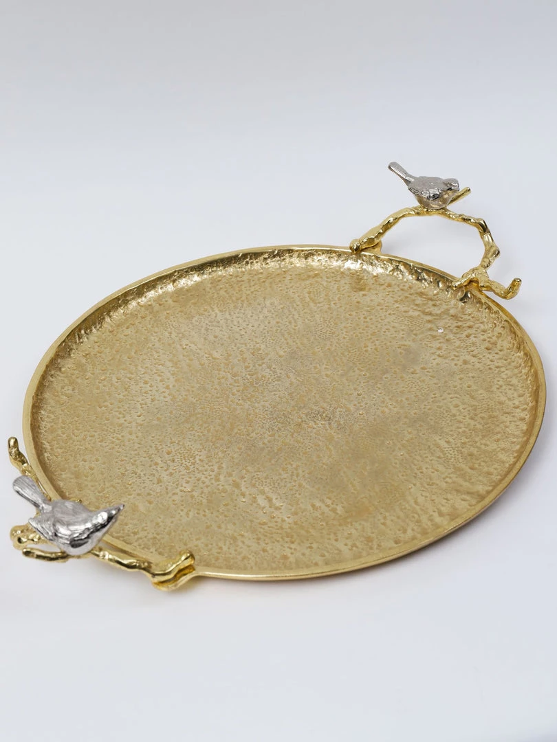 Description: This large gold decorative tray has adorable silver birds perched atop both handles. This will make a stunning vignette wherever you style it.